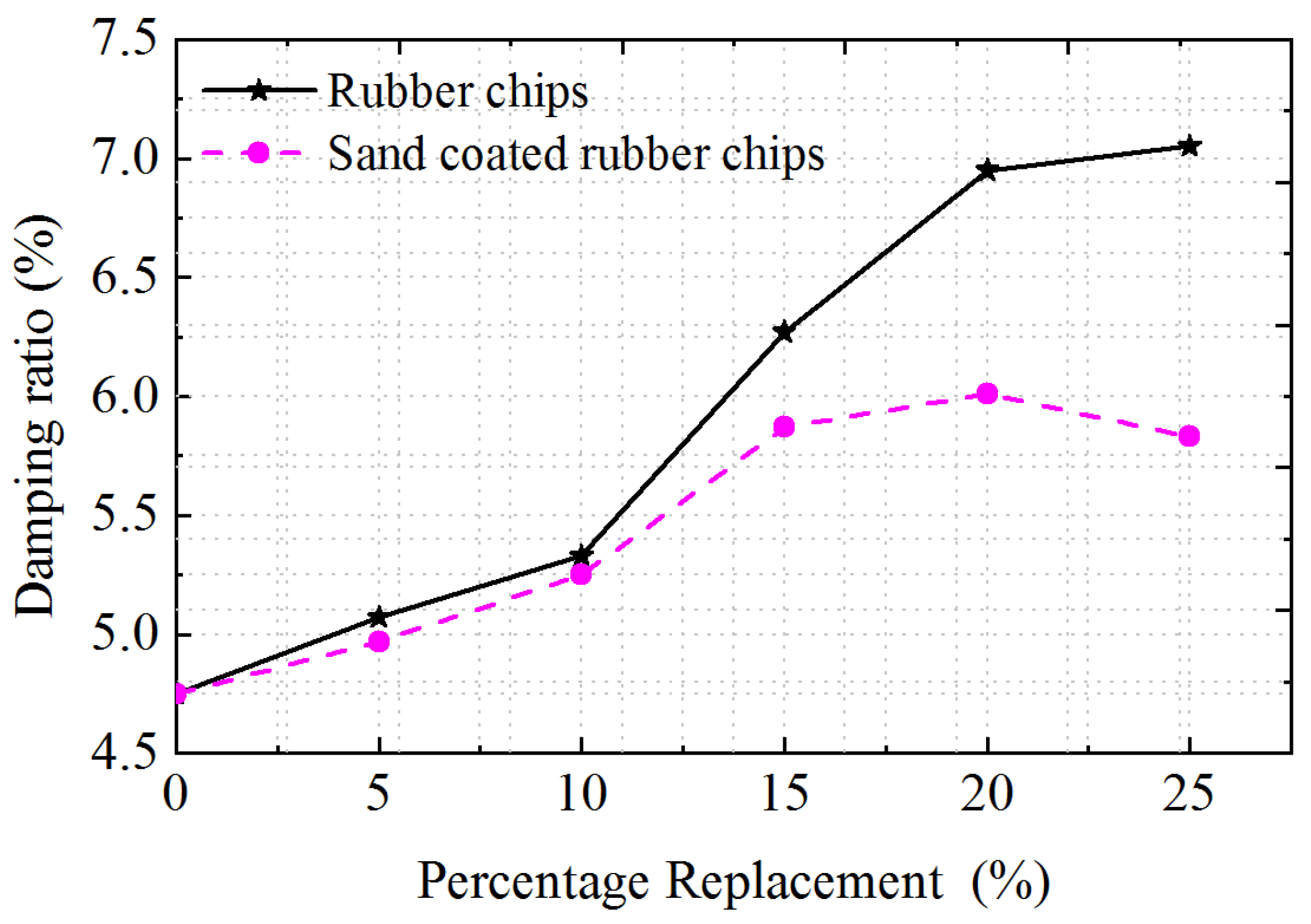 - To improve the damping properties of conventional concrete, partial replacement of natural coarse aggregates by chipped rubber and sand-coated rubber chips is suggested.