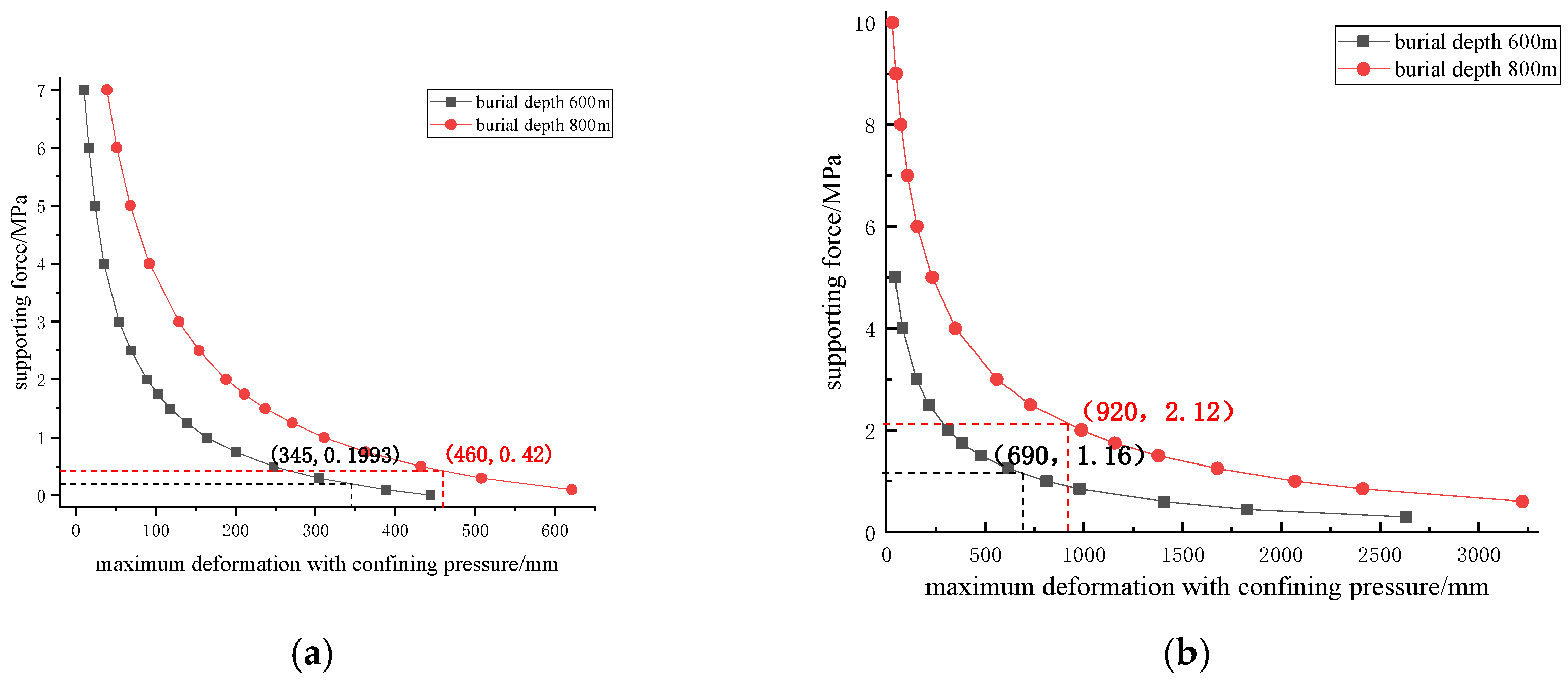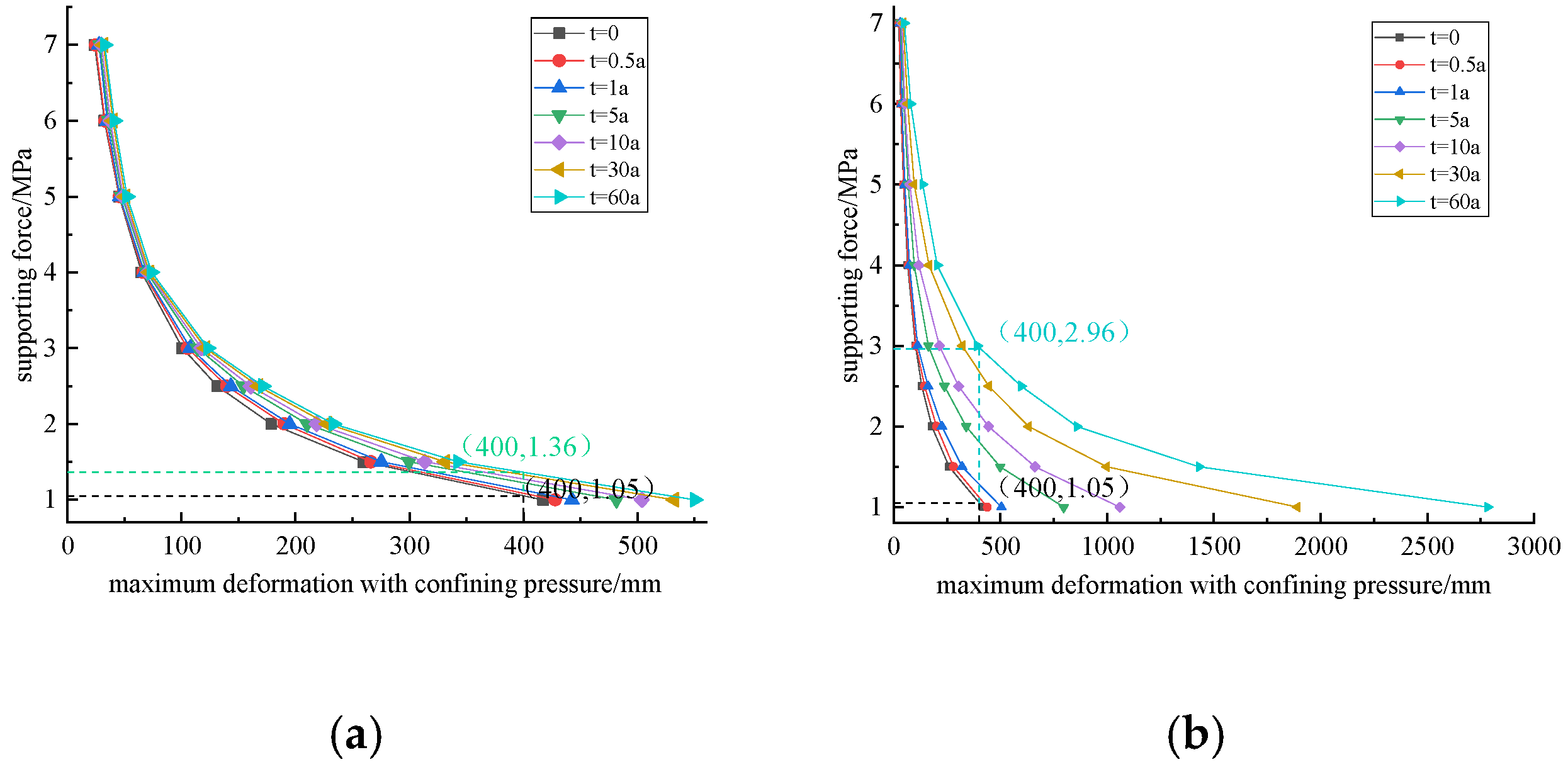 Relationship curve between support force and maximum deformation of surrounding rock considering time effect: (a) group 1 of creep parameters; (b) group 2 of creep parameters.