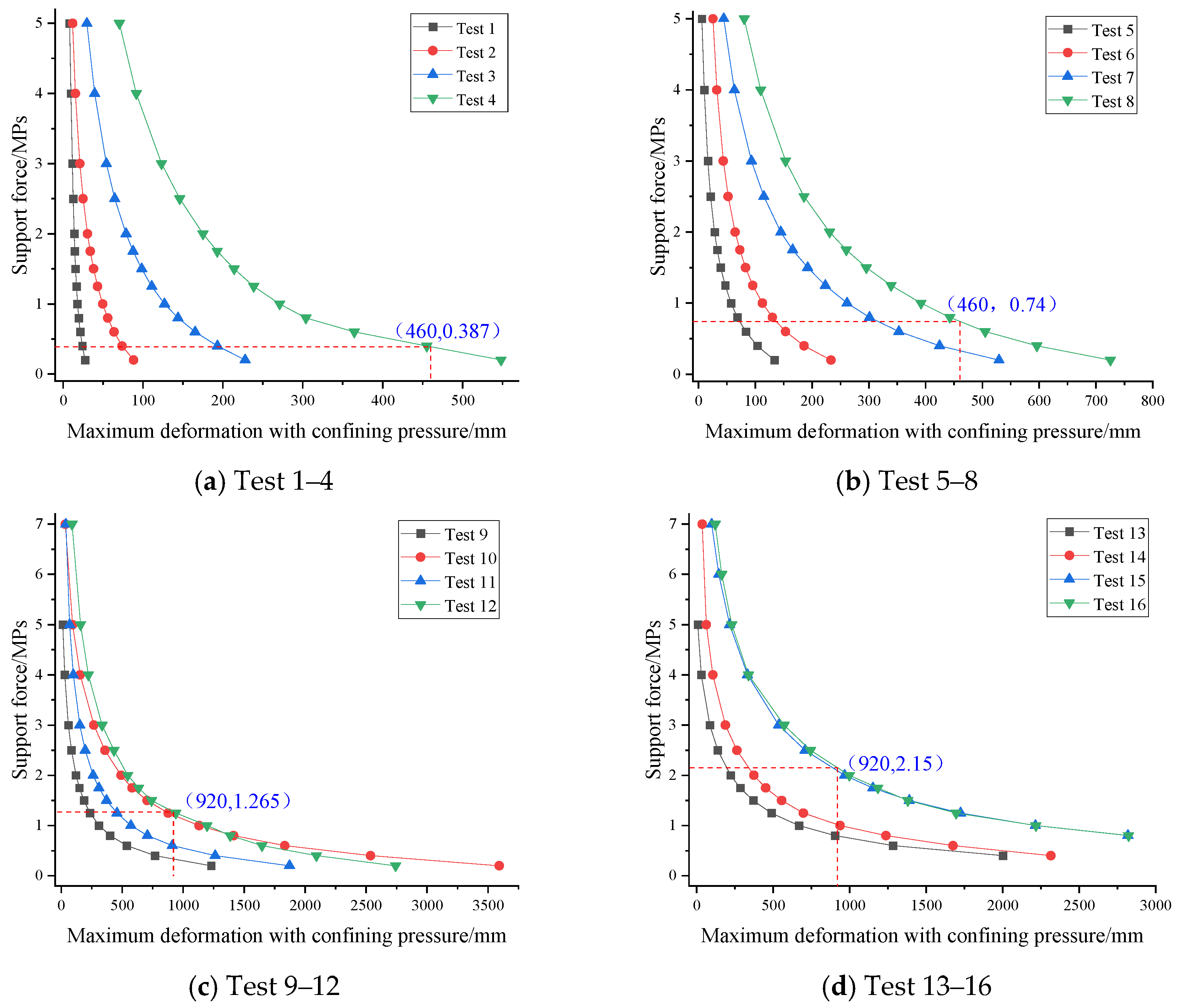 Relationship Curves between support pressure and maximum surrounding rock deformation for all test schemes: (a) Test 1–4; (b) Test 5–8; (c) Test 9–12; (d) Test 13–16.