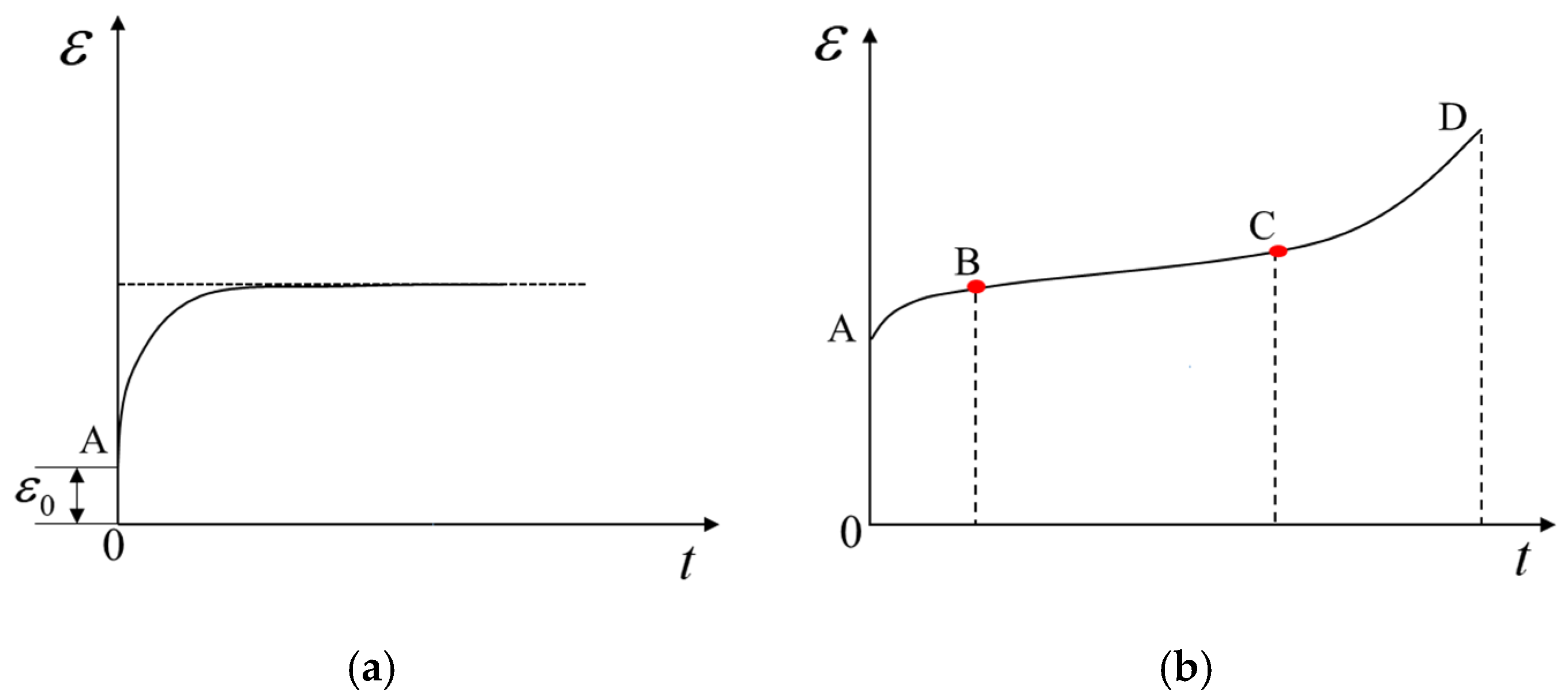 Creep curves of rock: (a) stable creep; (b) unstable creep.