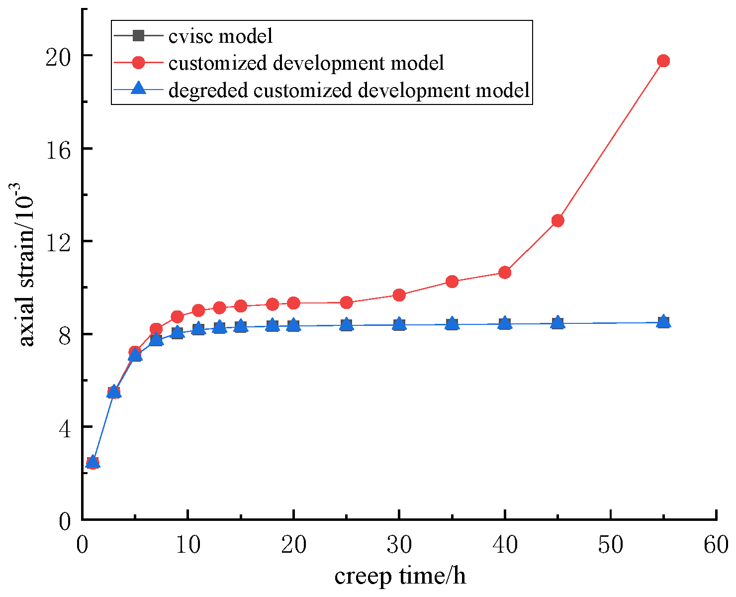 Variation curves of axial strain with time for Cvisc model and custom model.