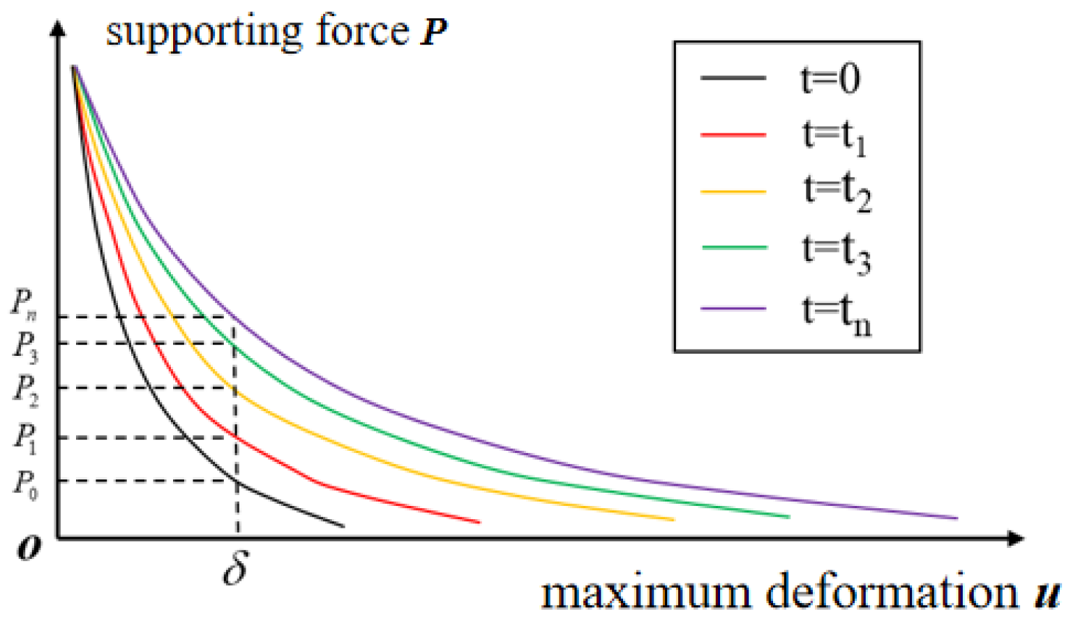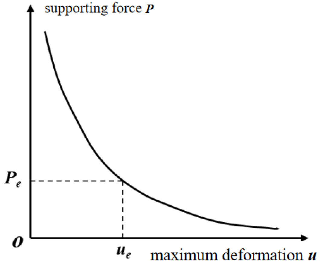 Relationship curve between support force and maximum deformation of surrounding rock at t = 0.
