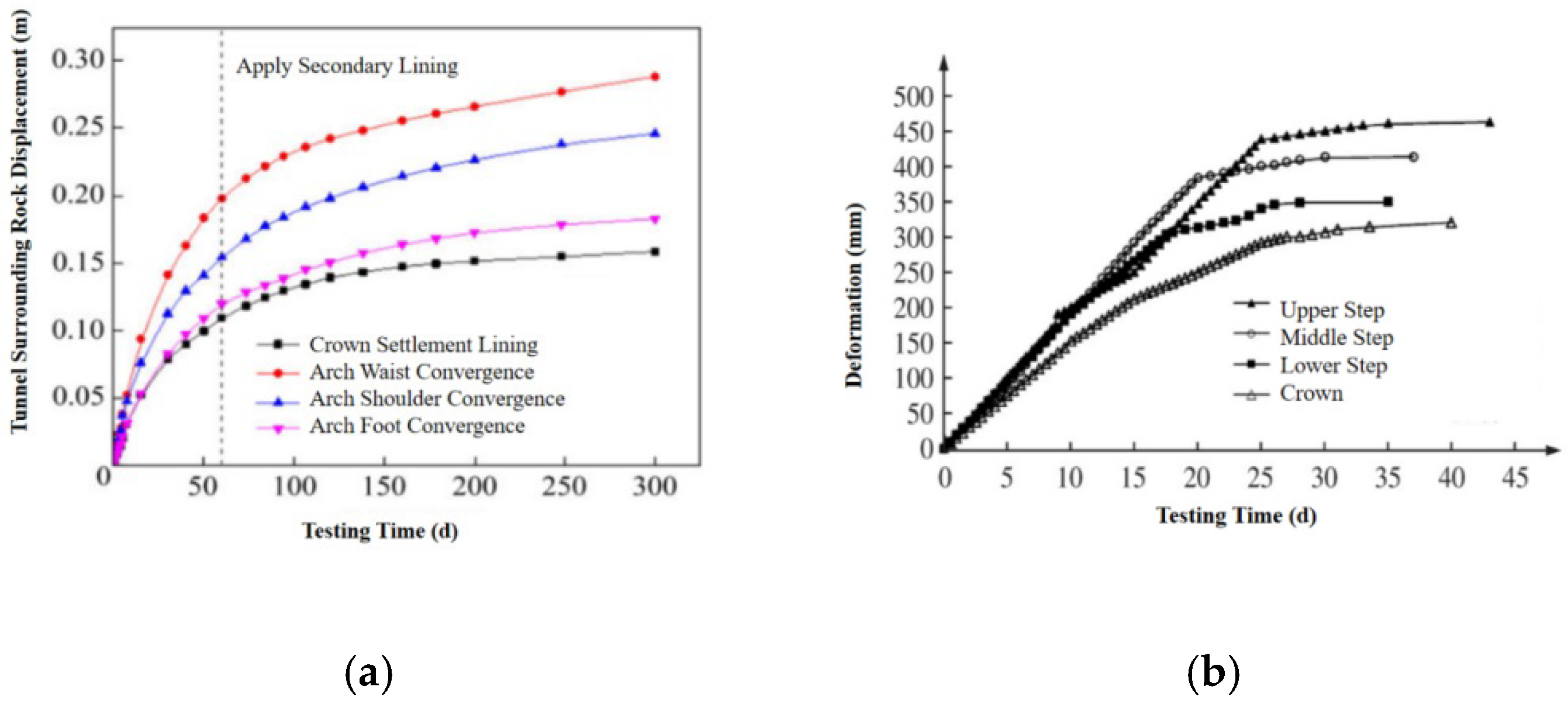 Tunnel surrounding rock displacement of Chengdu–Lanzhou Railway and Lan–Yu Railway Xinchengzi Tunnel: (a) Chengdu–Lanzhou Railway; (b) Lan–Yu Railway Xinchengzi Tunnel.