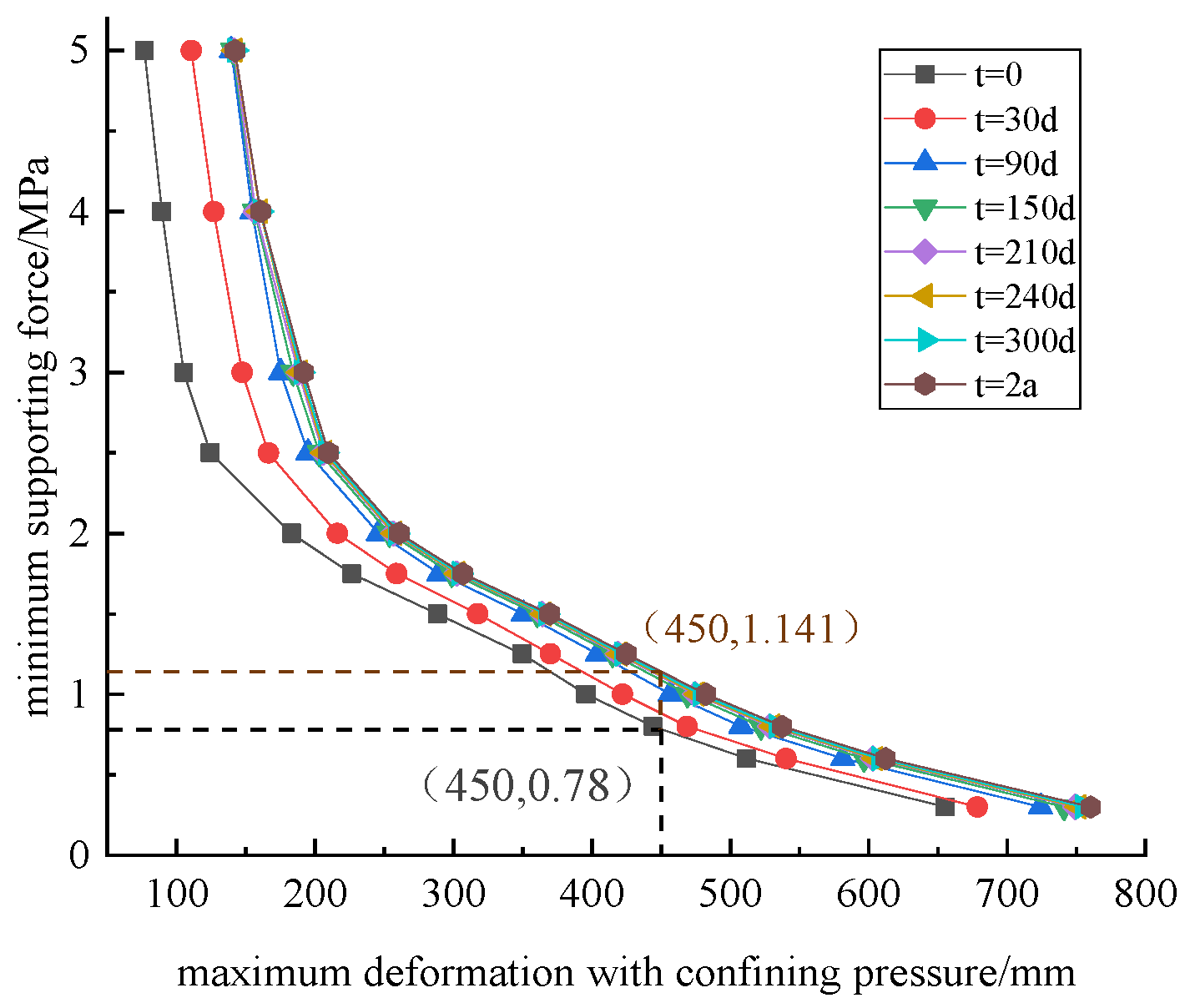 Relationship curve between support force and maximum deformation of surrounding rock at different times.