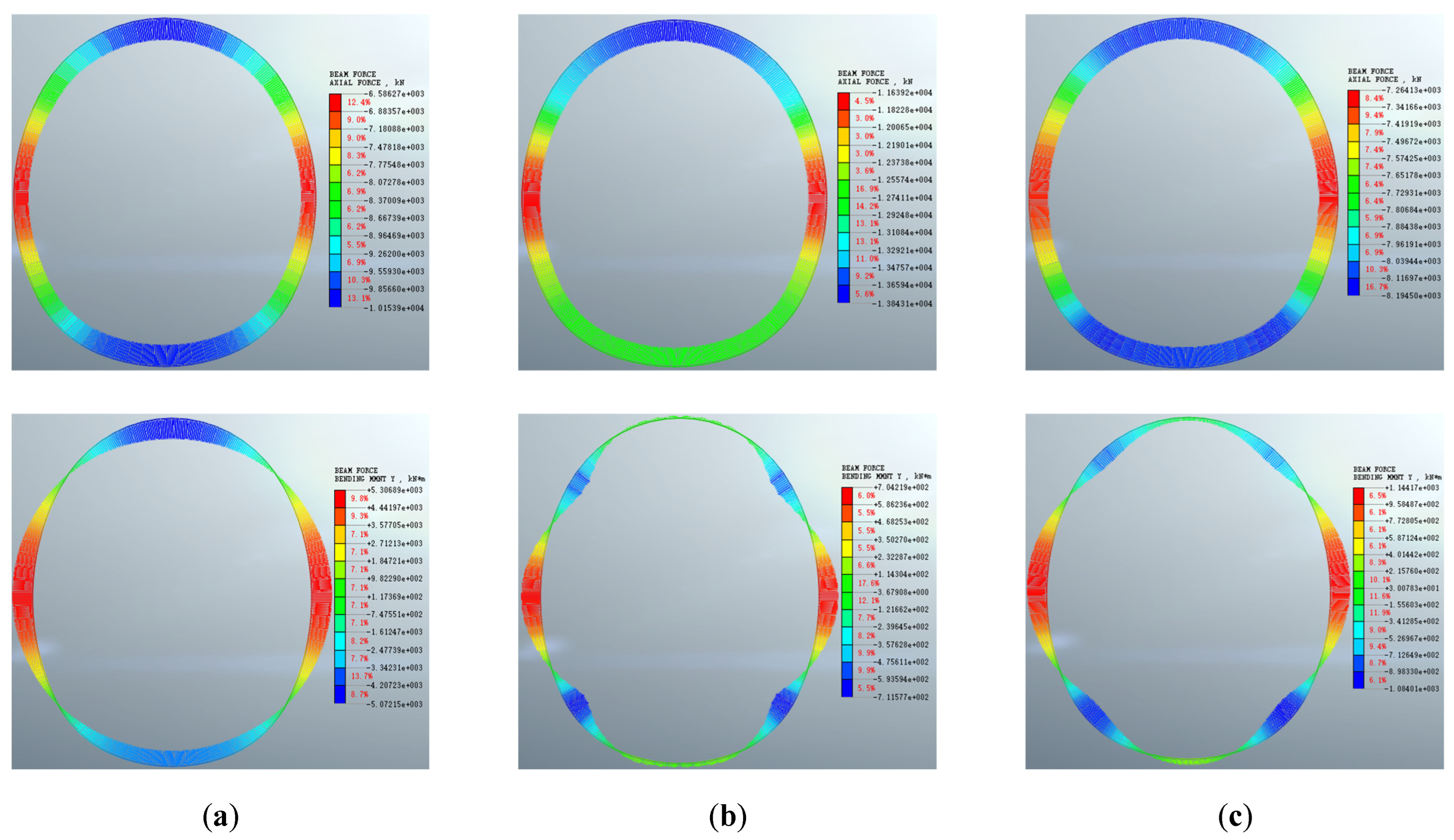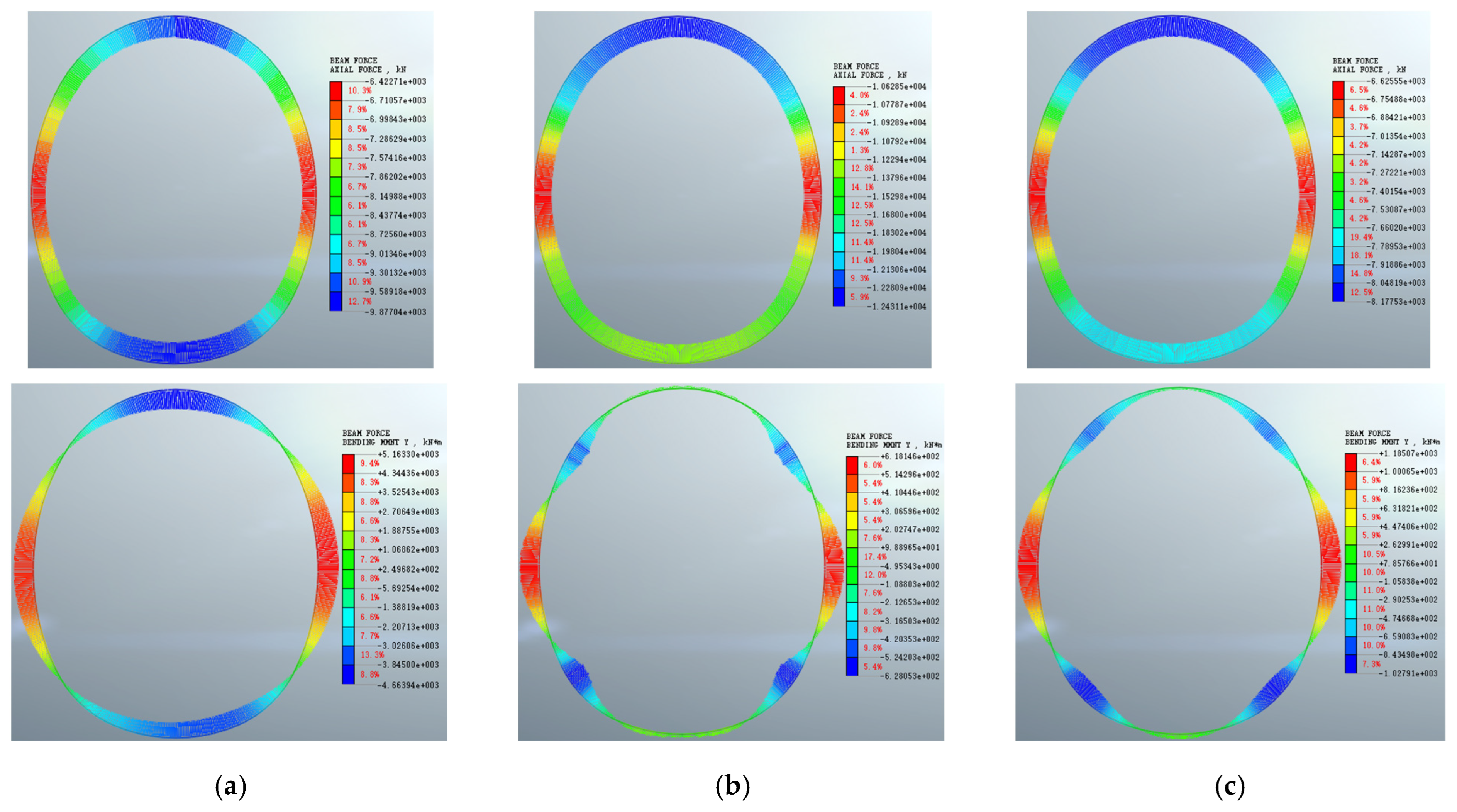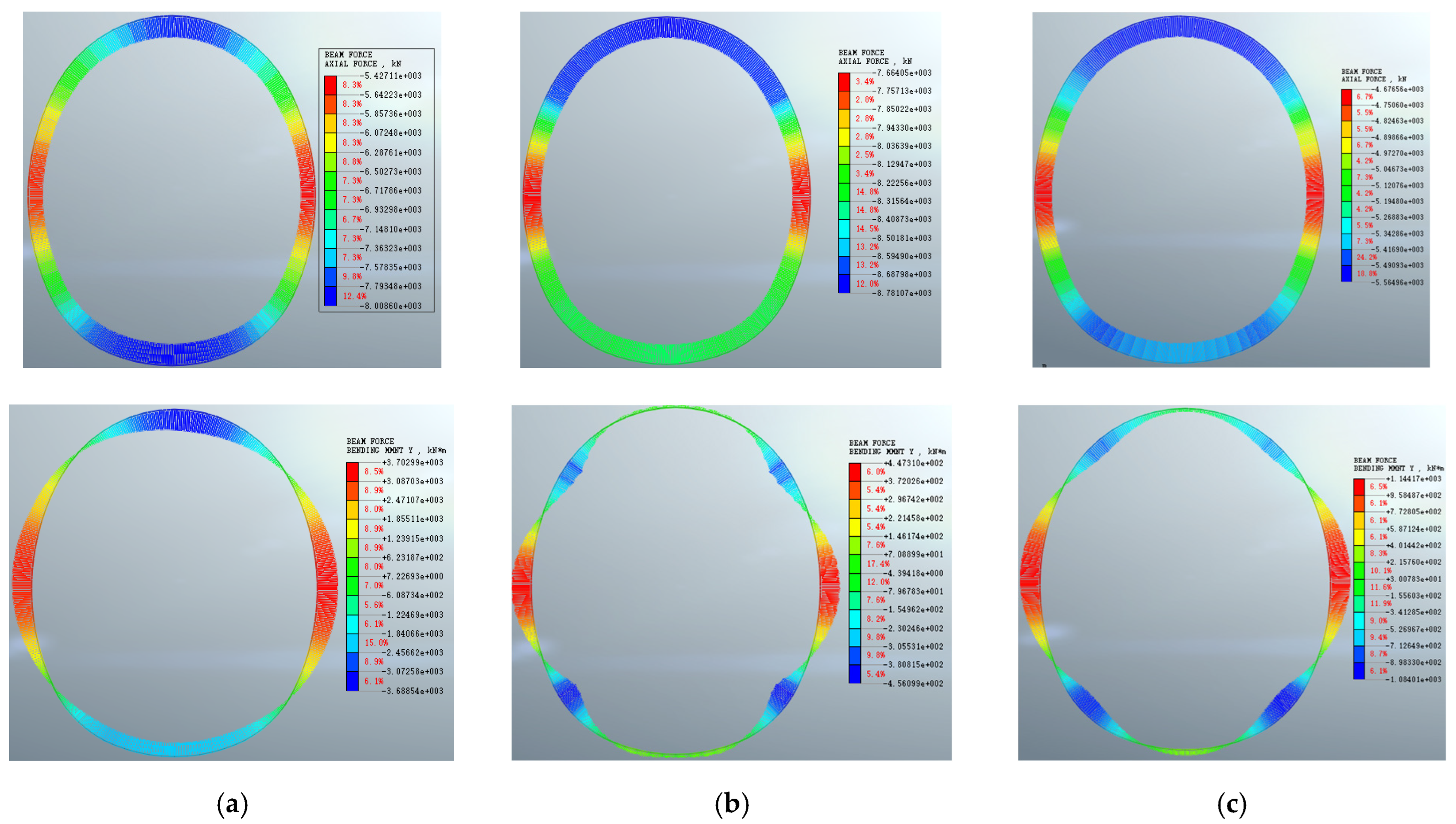 Axial force and bending moment diagrams of each support structure layer at t = 730 d: (a) rock-anchor bearing arch; (b) shotcrete; (c) secondary lining.