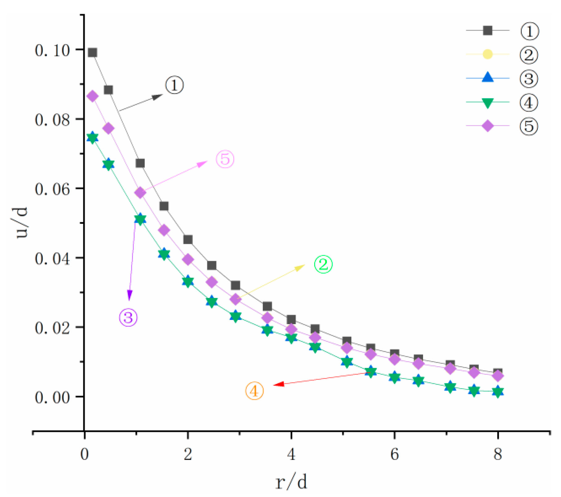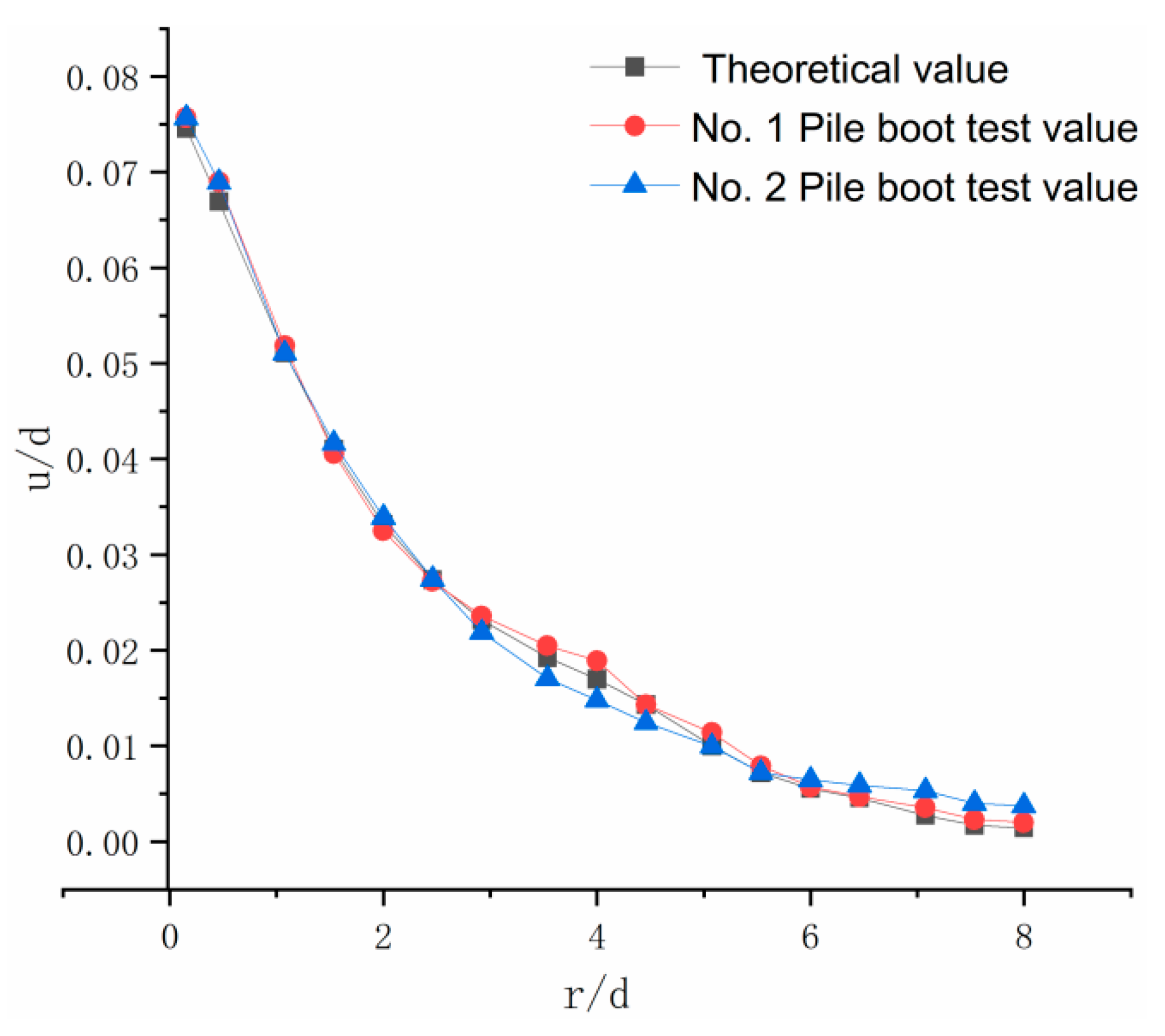 - The correction coefficient of the pile shoe geometric parameters is proposed based on the Mohr–Coulomb criterion and reaming theory. The correction coefficient λ is then used to determine the radius of the plastic zone and the displacement value of the plastic zone after correction. In order to determine the theoretical solution taking into account the smearing range of the pile shoe shape, a comparison and analysis of the theoretical model and the test model reveal that the results of the two are more consistent with one another, the error between the theoretical value and the test value is less than 5%, and the radius of the plastic zone after correction is larger than that of the traditional model. Taking into account the geometry of the pile shoes, the theoretical solution of the smearing range is found. Then, by adding five different sets of pile shoe geometry parameters, the correction coefficient λ is quantitatively verified. It is discovered that the correction coefficient λ can accurately reflect how the pile shoe geometry (a/d) affects the displacement and that the pile shoe geometry can increase the range of the soil coating; the displacement u is dominated by λ, which is independent of a and b, demonstrating the reasonableness of the correction coefficient.