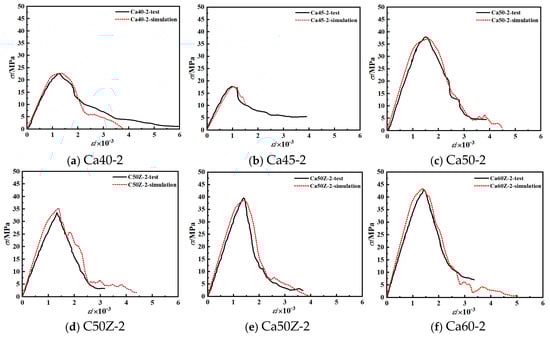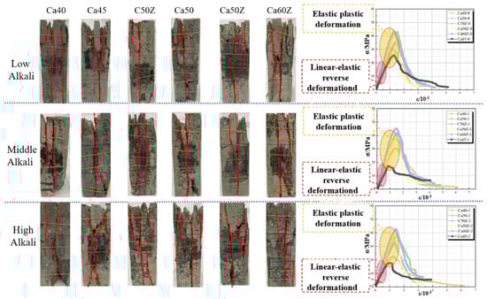 3.2. Failure Patterns Under Uniaxial Compression and Evolution of Stress–Strain Curves