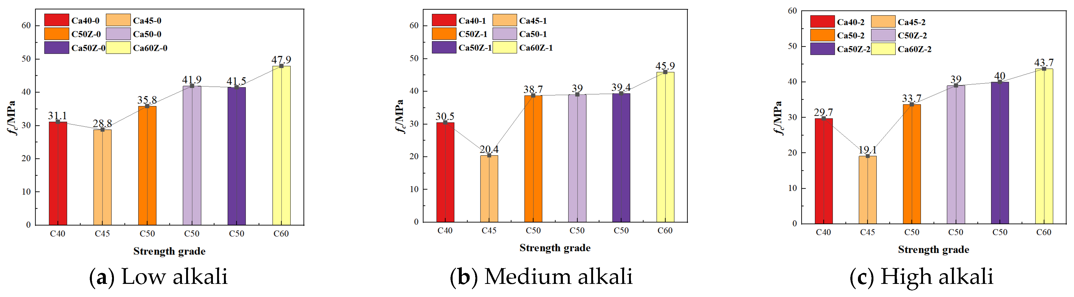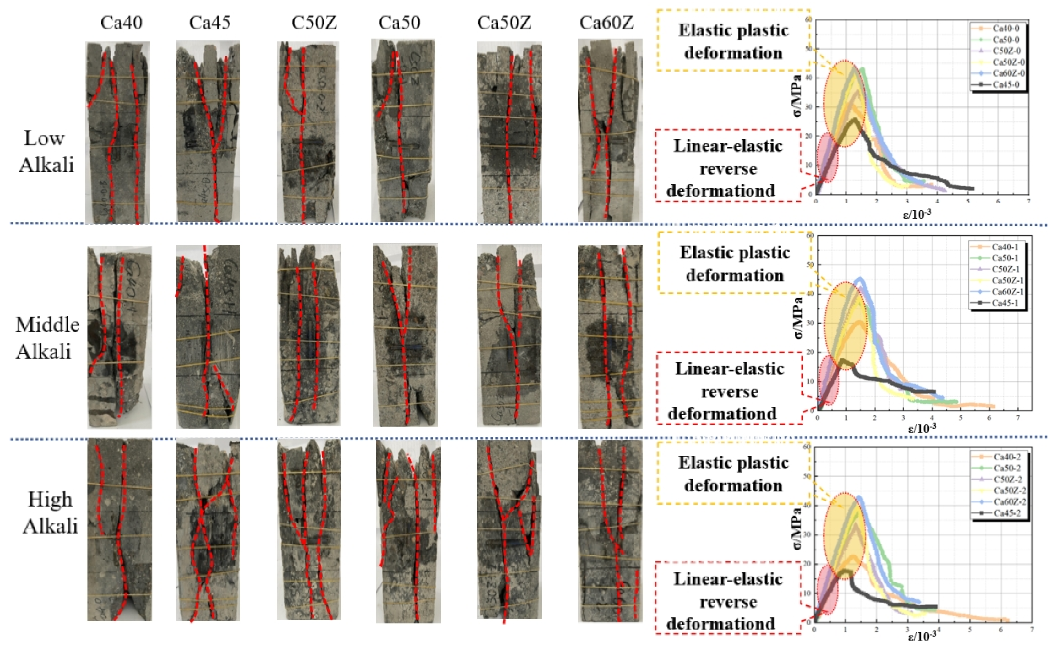 - While the axial compressive strength and elastic modulus of HPC increase with strength grade, they are reduced by elevated equivalent alkali content, which also intensifies internal damage and expansion. The observed linear dependence of strength on these damage parameters is of considerable significance, as it enables the non-destructive evaluation of compressive strength and offers substantial practical utility.
