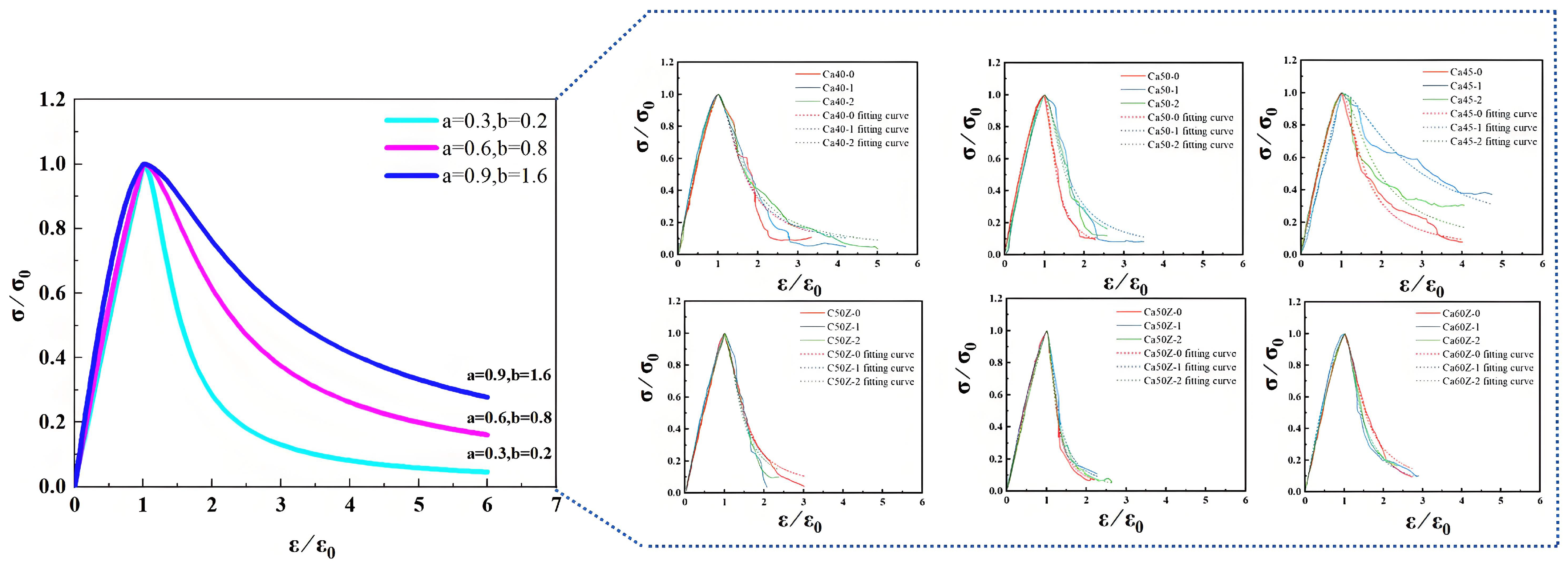- The study analyzed stress–strain curves and established a constitutive model, with parameters a and b influencing curve shape and concrete performance. An increase in a indicates that HPC exhibits predominantly plastic deformation in the corresponding stage, whereas a smaller a indicates mainly elastic behavior. As b approaches infinity, HPC demonstrates full ductility; conversely, when b = 0, the curve rapidly drops at the peak, indicating complete brittleness.