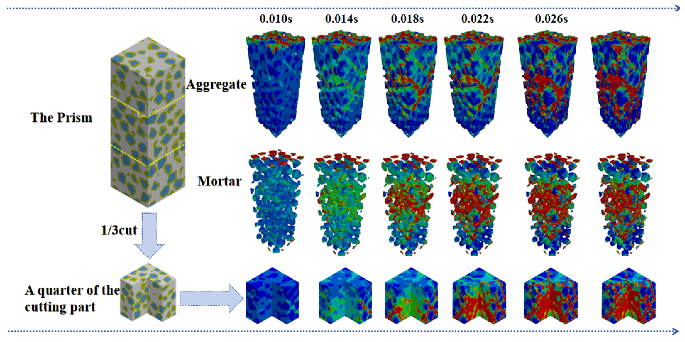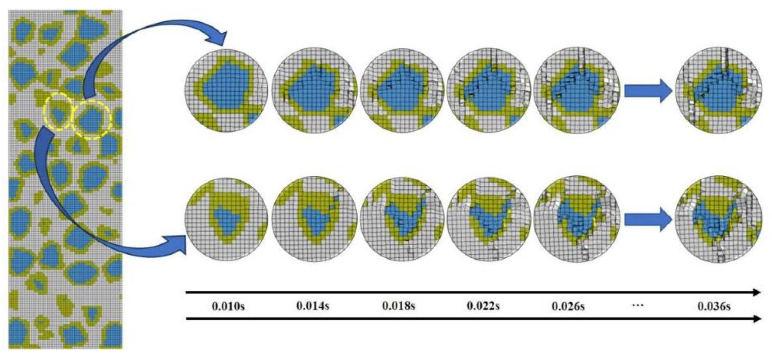 3.3. Numerical Simulation of Uniaxial Compression and Mesoscale Damage Mechanism of HPC Under Long-Term Alkali Solution Immersion