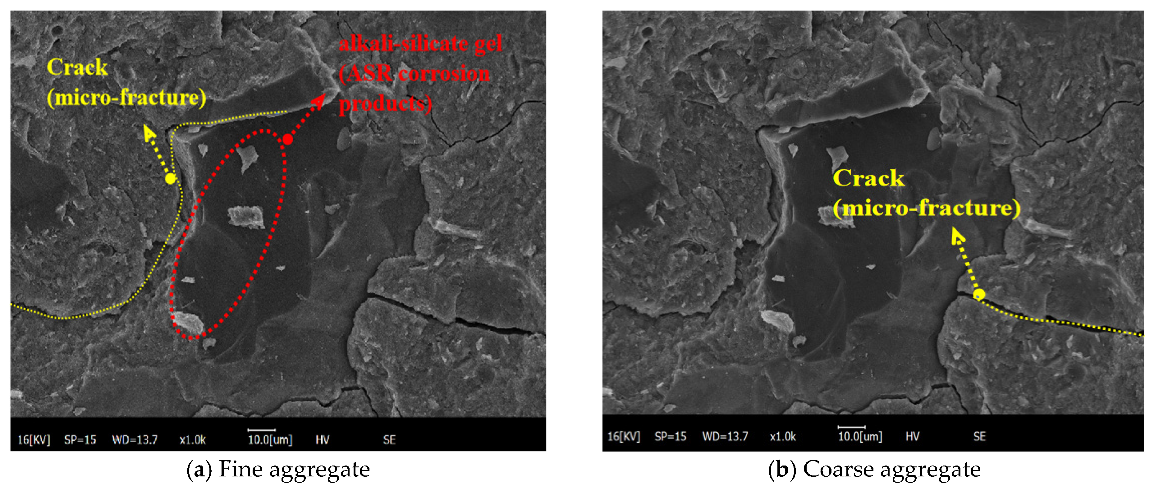 - Mesoscale simulations of alkali-exposed HPC under uniaxial compression revealed distinct failure mechanisms correlated with strength. Low-strength specimens exhibited poor integrity, with cracks initiating from multiple sites, propagating extensively, and causing pronounced spalling. Conversely, high-strength concrete demonstrated superior crack resistance, characterized by fewer, more localized cracks that often coalesced into a single dominant shear fracture. Cross-sectional analysis confirmed that cracking consistently initiated within the mortar phase and propagated inwards under load, ultimately forming characteristic diagonal failure planes. By studying the SEM-EDS images, it was found that ASR only occurs in the local area of HPC, and does not cause serious cracking damage, which shows the design of the specific mix ratio HPC in this paper can effectively inhibit ASR. And HPC still has good corrosion resistance in long-term alkali solution immersion.
