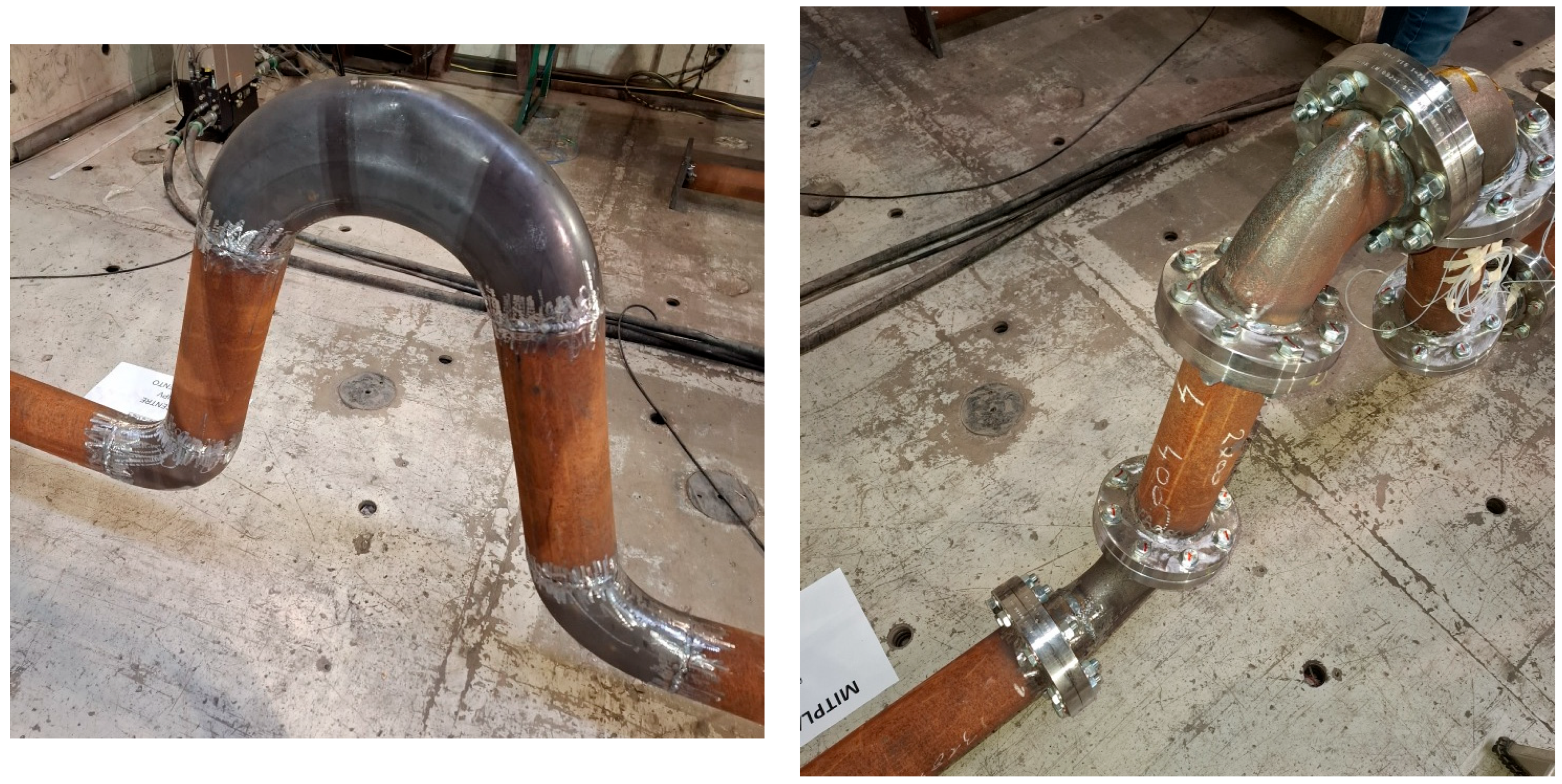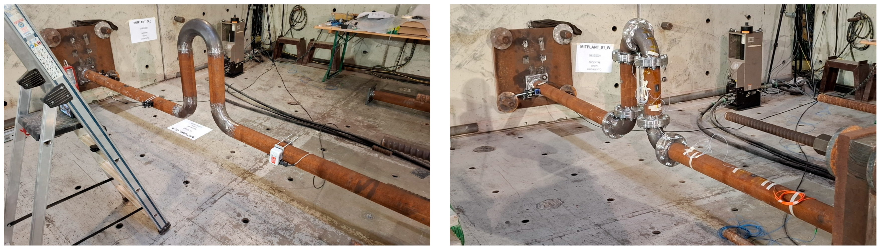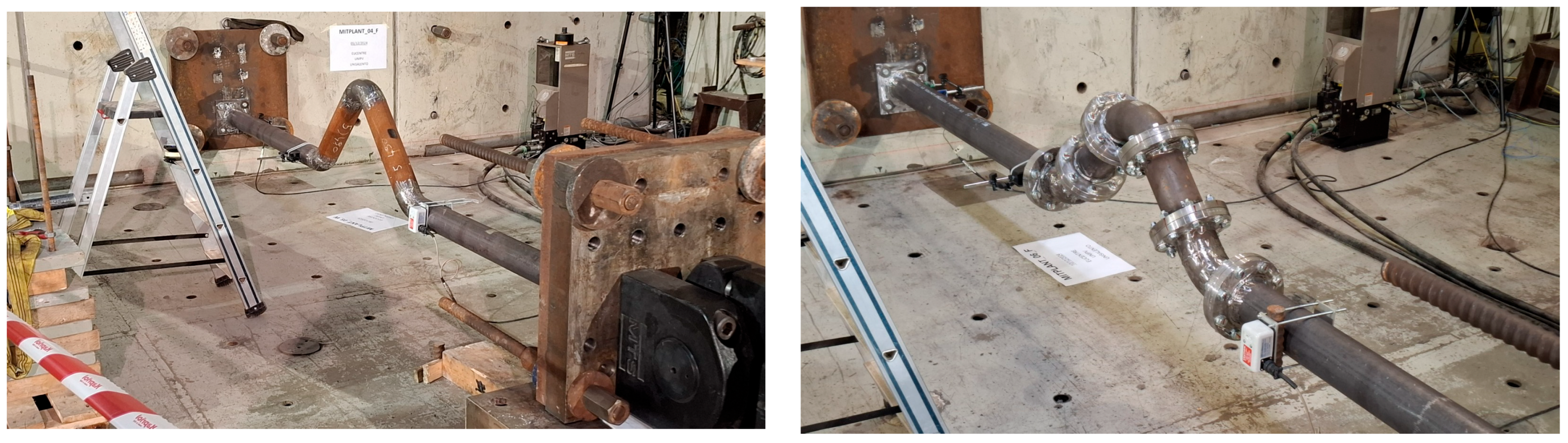 - Nakamura, I.; Shibutani, T.; Kuriyama, Y.; Kasai, N. Shaking Table Test on a Piping System Model for Developing High-Quality Simulation Model. In Volume 7: Seismic Engineering; ASME Nondestructive Evaluation, Diagnosis and Prognosis (NDPD) Division; The American Society of Mechanical Engineers: New York, NY, USA, 2023. [Google Scholar] [CrossRef]