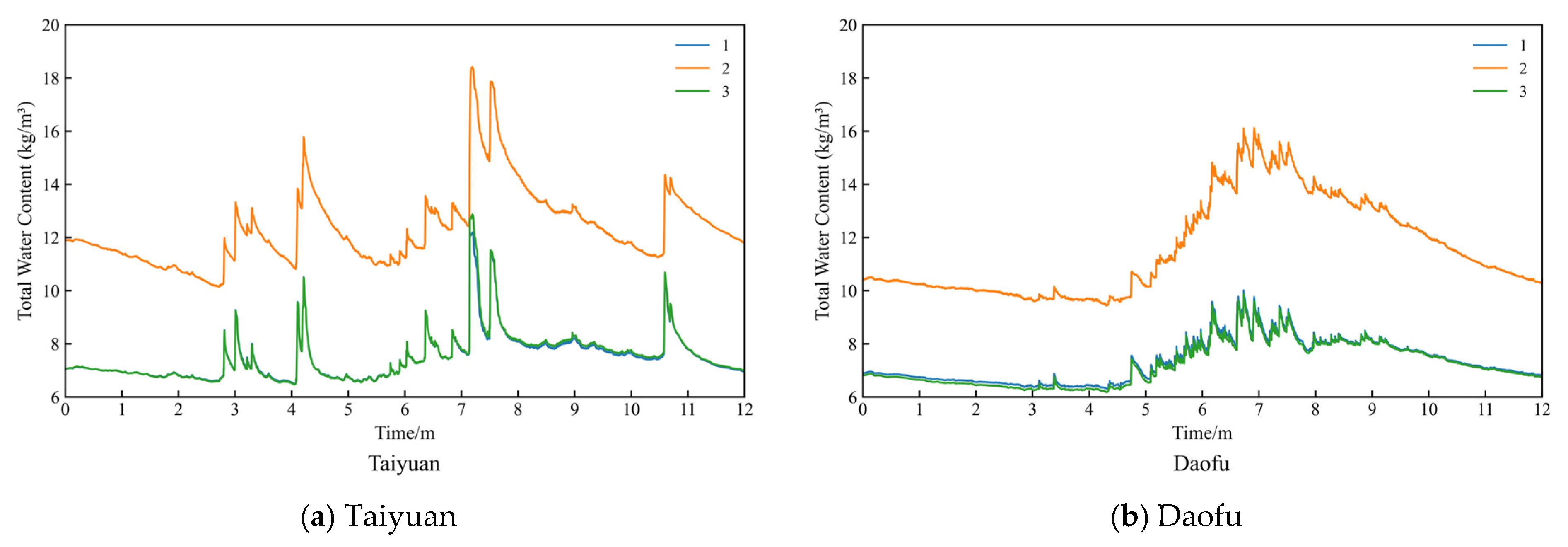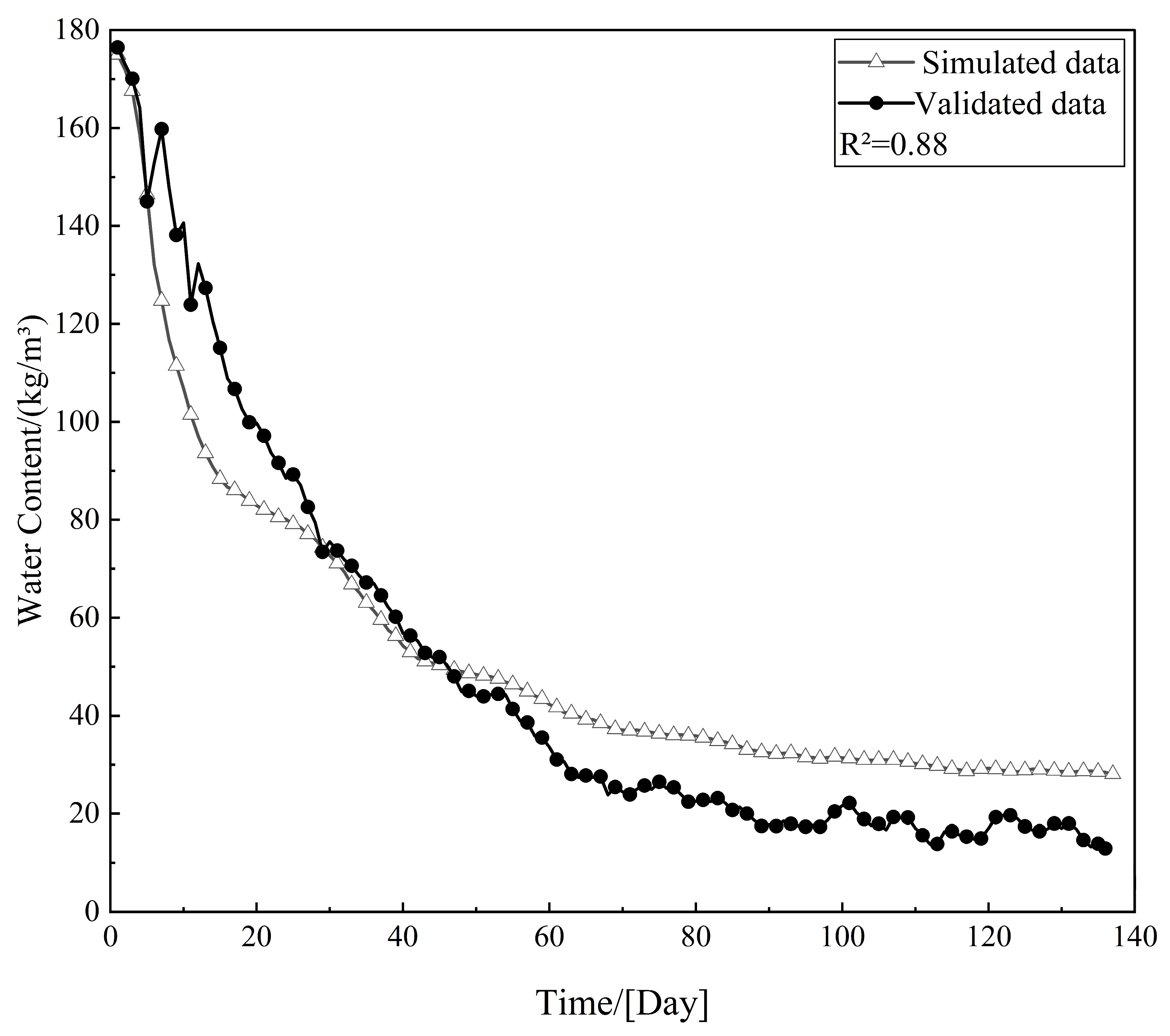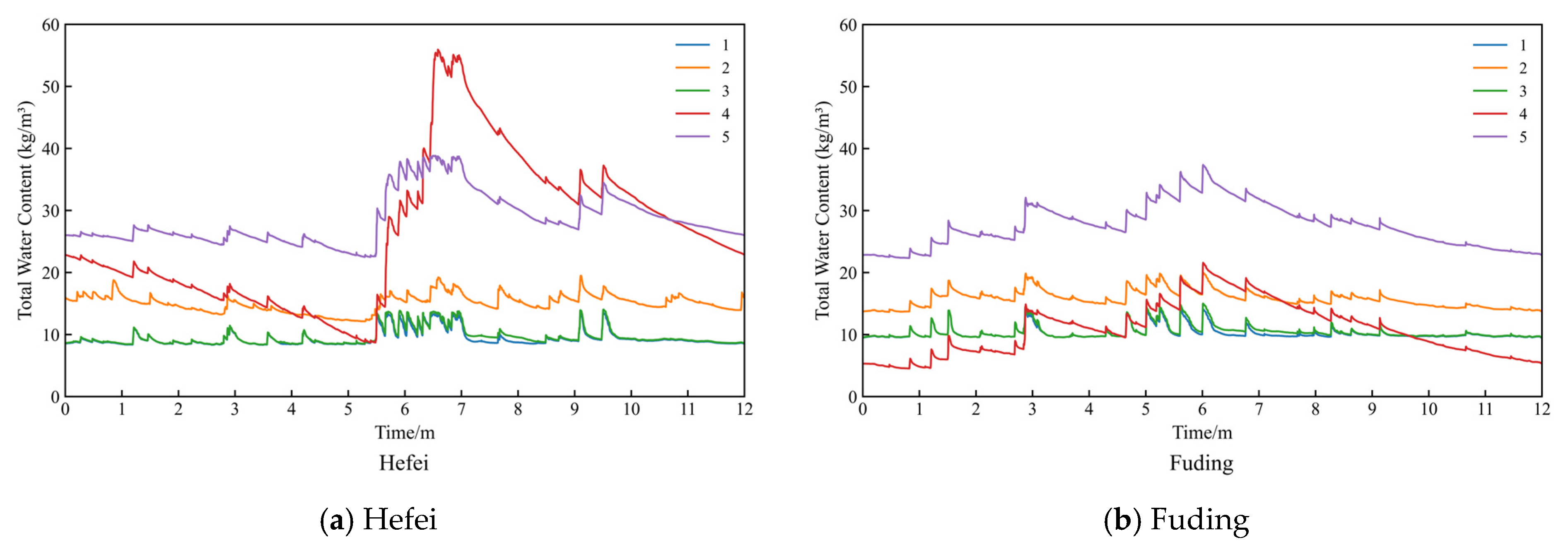 In hygrothermal simulations, moisture content serves as the primary indicator of wall performance because it directly reflects the dynamic balance between wetting and drying under coupled heat–moisture transfer. The accumulation of moisture not only accelerates material degradation but also alters thermal conductivity and reduces insulation efficiency [