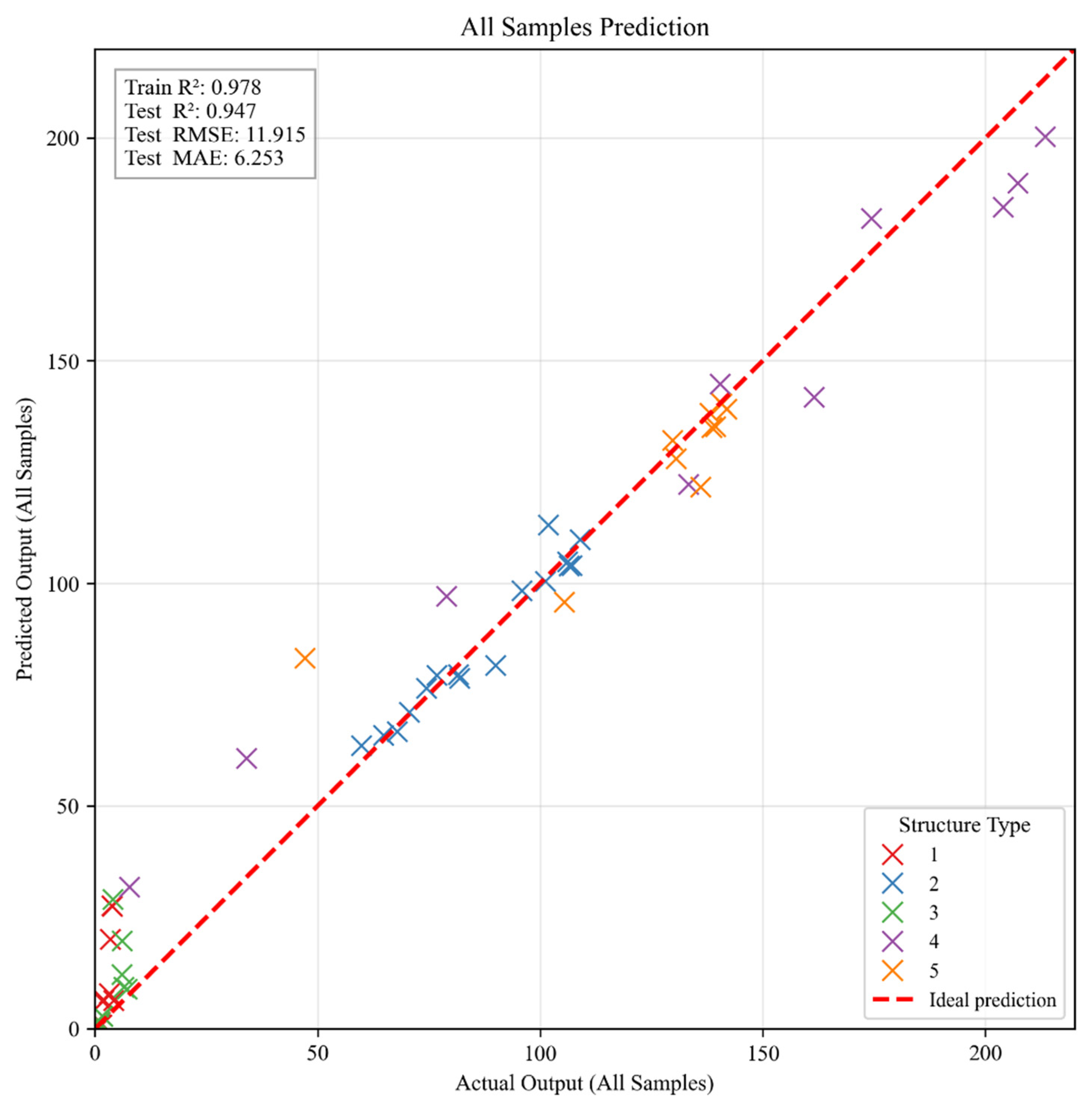 Figure 3. These results indicate good agreement between predicted and measured values, along with strong generalization ability. Therefore, this model can serve as a reliable surrogate model for subsequent sensitivity analysis.