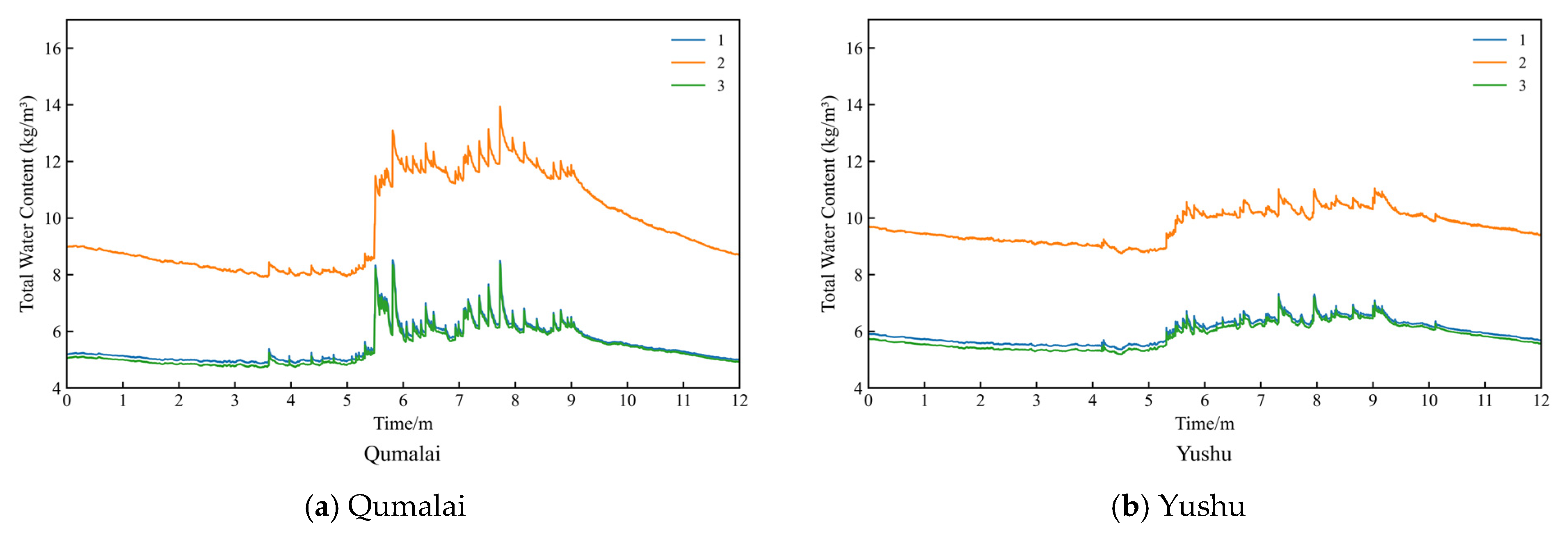 Notably, among all locations, all types performed the smallest seasonal fluctuations in total moisture content in Yushu (