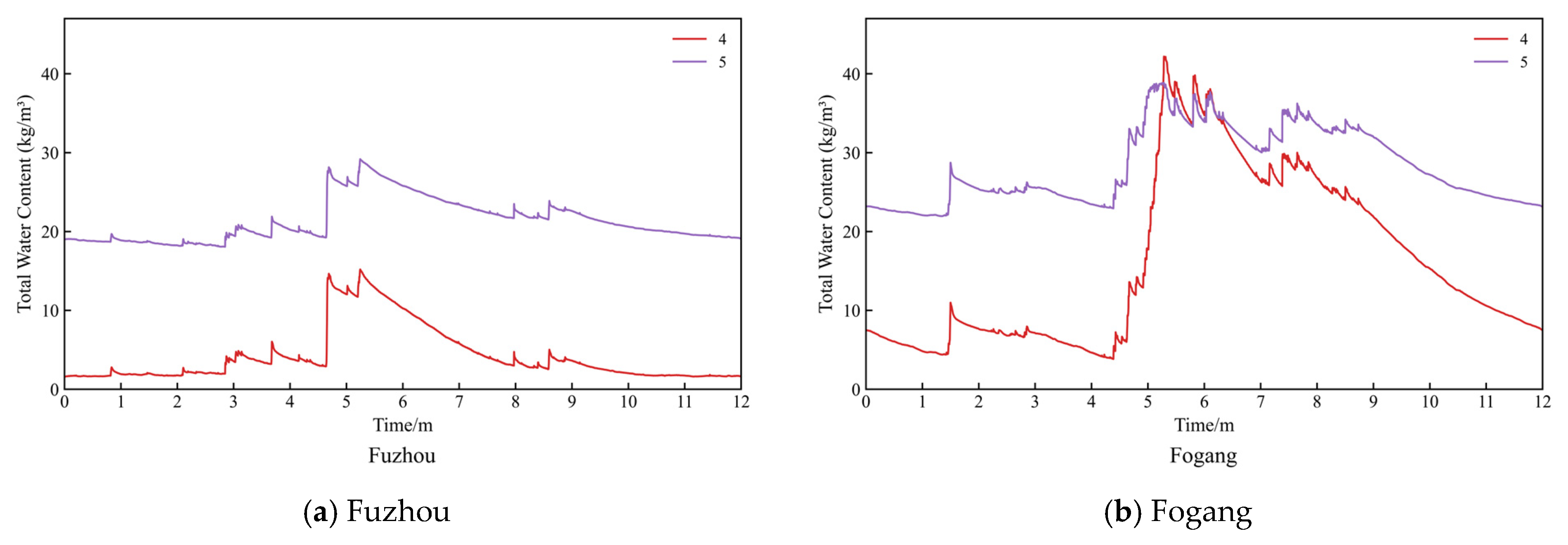 In the Hot Summer and Warm Winter Zone, two wall assembly types were simulated, i.e., Type 4 and Type 5. Generally, Type 5 consistently exhibited higher overall moisture content than Type 4 throughout the year. From the perspective of material layers, this difference is attributable to the vapor diffusion resistance factor of the autoclaved aerated concrete blocks in Type 4 being 8.3, which allows faster diffusion, whereas the concrete wall layer in Type 5 has a vapor diffusion resistance factor of 92, leading to longer diffusion times and greater moisture accumulation. However, in Fogang, Guangzhou, and Shantou, Type 4 may exhibit notably higher total moisture content than Type 5 during the summer period (