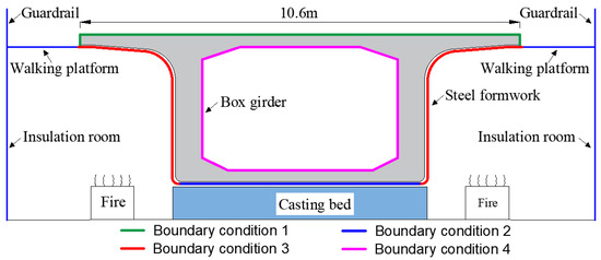 The temperature boundary conditions for the large-scale box girder are categorized into four types, as detailed in Figure 1. Boundary Condition 1: The top and side surfaces of the top slab are exposed to ambient air, accounting for the influence of natural wind speed. Boundary Condition 2: The bottom surface of the bottom slab is set in contact with the steel formwork, with no wind speed effect considered. Boundary Condition 3: The outer surfaces are defined to be in contact with steel formwork for the initial 54 h, during which no wind speed is considered when the insulation room is deployed. The time-dependent temperature in the insulation room is applied as a Boundary Condition to the external surfaces of the box girder, and an equivalent heat dissipation coefficient is employed in the numerical model. After the steel formwork removal at 54 h, these surfaces are exposed to ambient air, and the natural wind speed effect is incorporated. Boundary Condition 4: The interior surfaces of the box girder are exposed to the internal air. However, due to the coverage by geotextiles at both ends, the wind speed effect inside is neglected. In the numerical model, the thicknesses of the bottom and side formworks were specified as 10 mm and 8 mm, respectively. The thermal conductivity of steel formwork is 163.3 kJ/(m·h·°C). A transient analysis is performed, in which the initial temperature of the box-girder concrete is set to its placing temperature. The adopted time step is specified as 1 h, with a total analysis duration of 95 h.