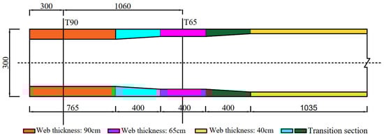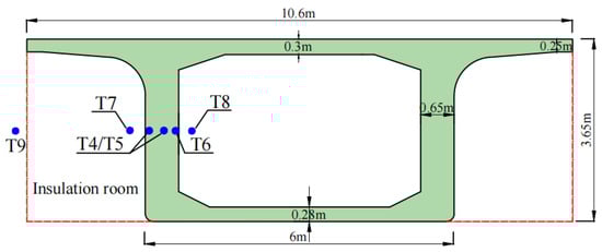 The 60 m box girder has an identical outer contour. Their webs primarily consist of three standard thicknesses of 90 cm, 65 cm, and 40 cm, complemented by progressively transitioning web segments. Temperature sensors are installed on the T90 and T65 sections of the 60 m box girder. These sections have thicker webs. The sensors can continuously monitor the early temperature field during prefabrication. The monitoring section diagram is illustrated in Figure 3. Temperature measurements are conducted using JMT-36B sensors (Changsha Jinma Co., Ltd., Changsha, China), with a measurement range of −30 to 120 °C and a sensitivity of ±0.1 °C. The measuring points arrangement of the T90 and T65 sections is shown in Figure 4 and Figure 5. Specifically, measurement points T1, T2, and T3 are installed at section T90, while T4, T5, and T6 are positioned at section T65. Points T7 and T8 are primarily used to monitor the ambient temperature inside and outside the box girder, respectively. Measurement point T9 is used to record atmospheric temperature. For temperature analysis, the time zero is set as the completion of concrete pouring for the box girder. Temperature data are acquired continuously at a frequency of once per hour until 95 h after pouring.