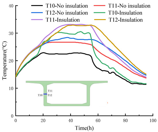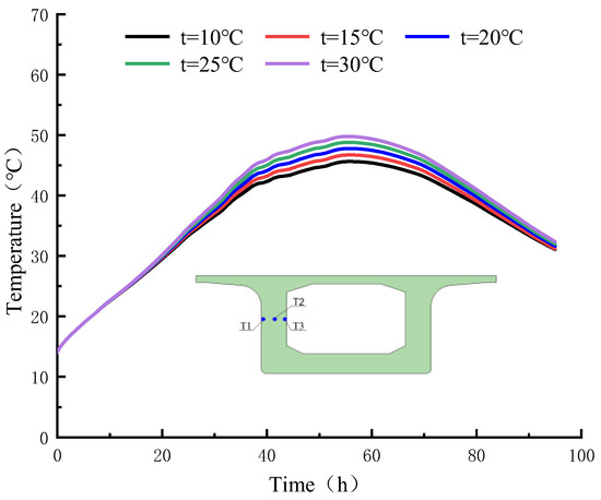 The insulation temperature has essentially no significant effect on the timing of the peak temperature in the box girder. The peak temperatures in the webs of the T90, T65, and T40 sections occur at approximately 53 h, 48 h, and 41 h, respectively, indicating that the timing of peak temperatures varies significantly across different sections. The reason is that thicker webs generate more hydration heat. Under identical boundary heat dissipation conditions, this leads to progressive heat accumulation within the box girder, consequently delaying the occurrence of the peak temperature. It is noted that the peak temperature in the T90 section with thicker webs occurs at 53 h, primarily due to the assumption that the external formwork is removed for thermal dissipation calculations commencing at the 54th hour. Subsequently, the exposed web concrete rapidly dissipates heat, resulting in a pronounced cooling trend on the exterior surfaces of the box girder.
