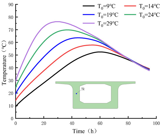 In actual construction, controlling the placing temperature of the box-girder concrete is relatively straightforward. To identify a suitable placing temperature, this study investigates the effects of concrete placing temperatures of 9 °C, 14 °C, 19 °C, 24 °C, and 29 °C on the temperature field distribution in a 60 m box girder.