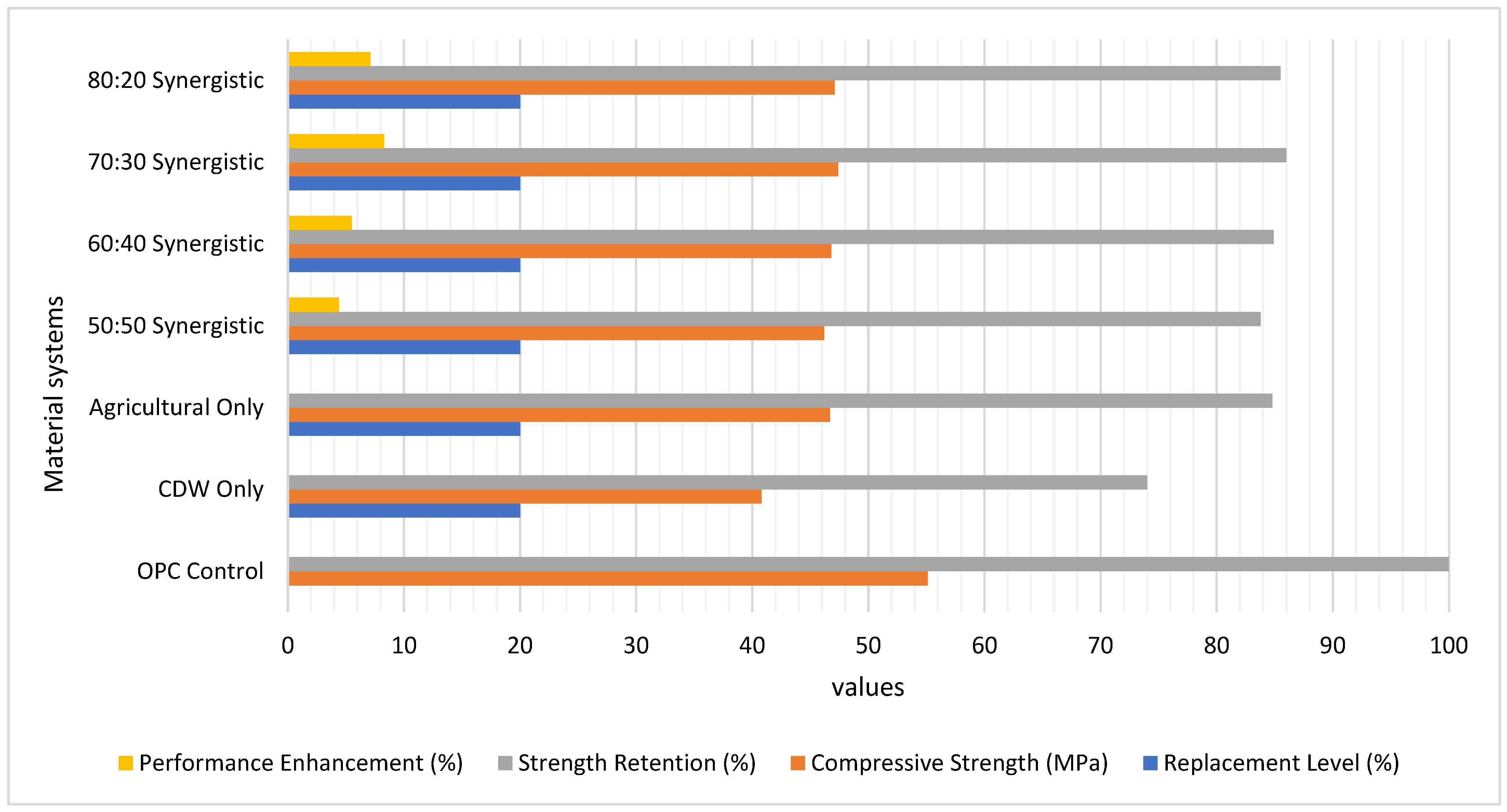 | This study: 70:30 synergistic | 5.63 | Current analysis | Competitive with mature SCM systems |
