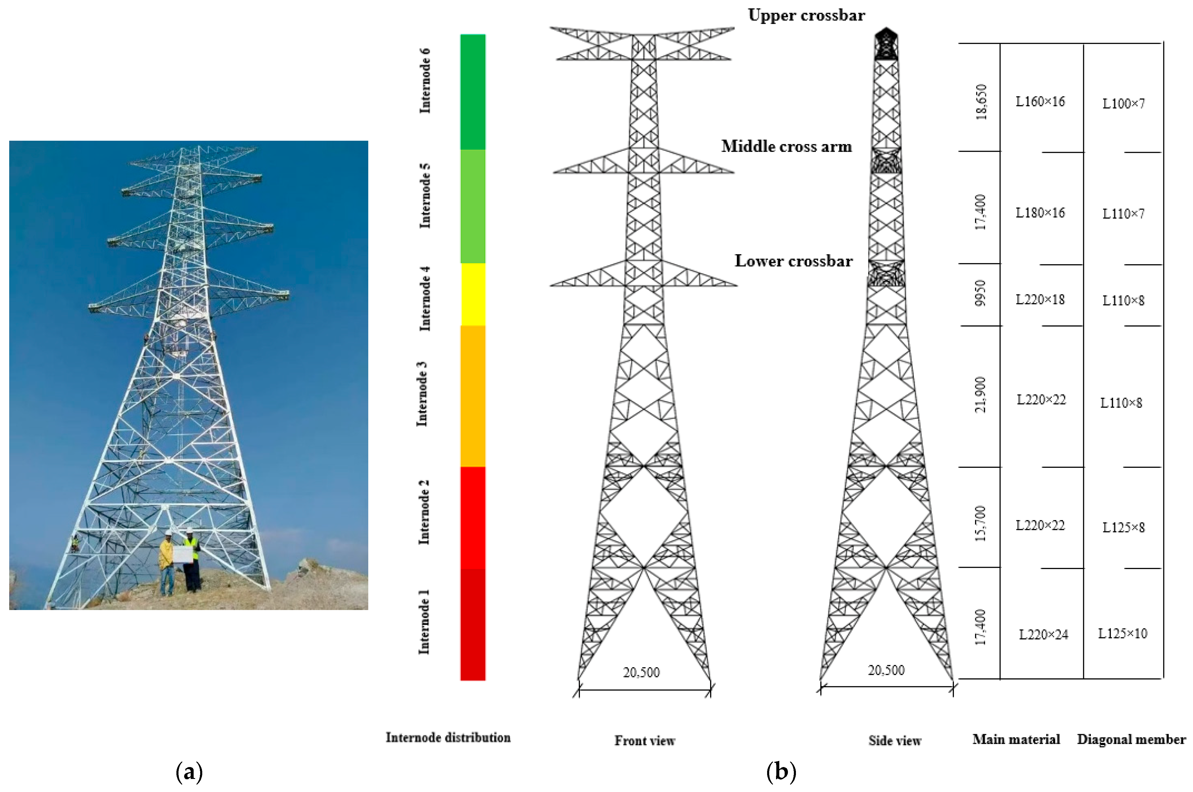 Figure 1. The information of the transmission tower. The images are listed as follows: (a) the photo of this project and (b) design information (unit: mm).
