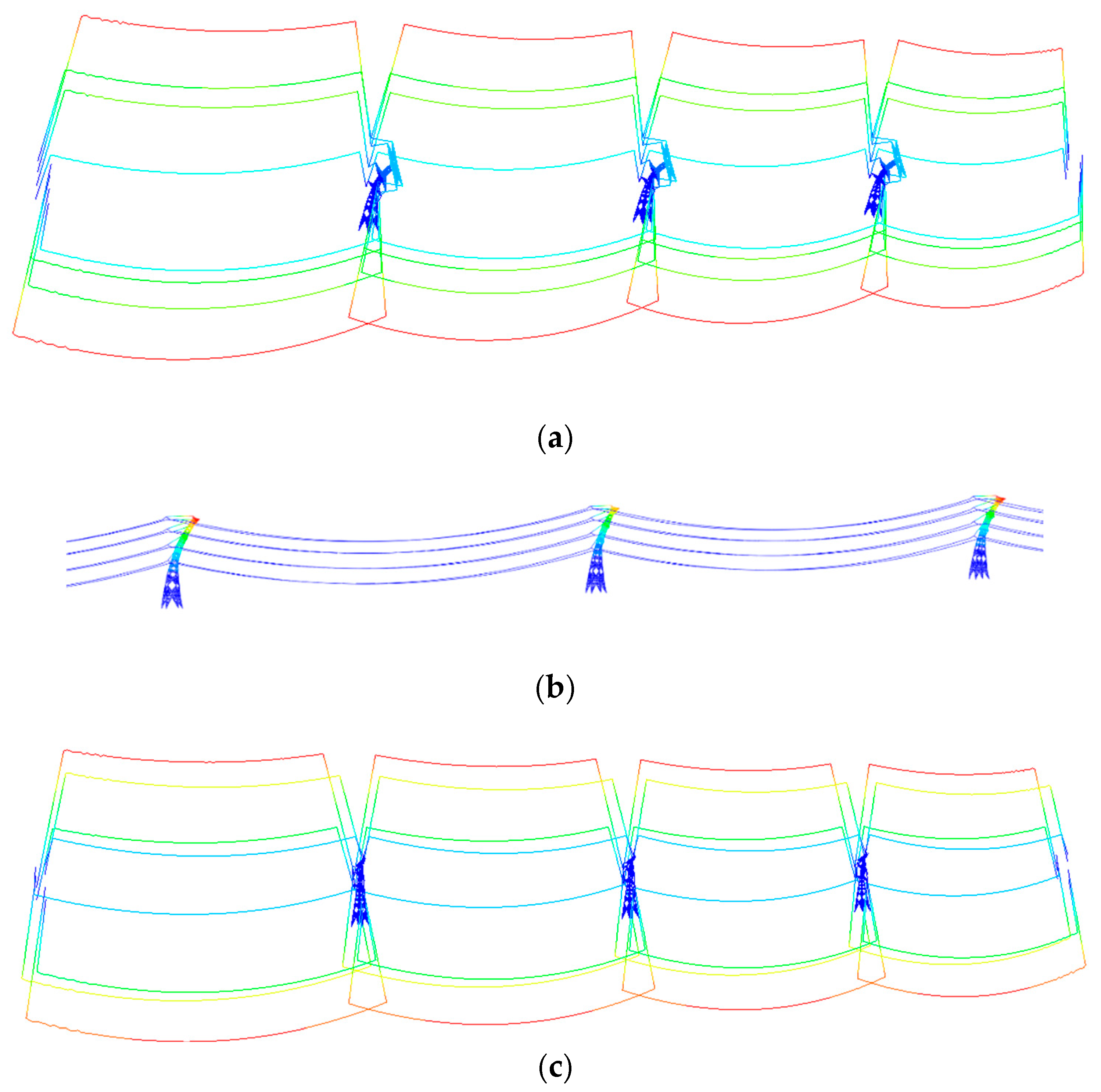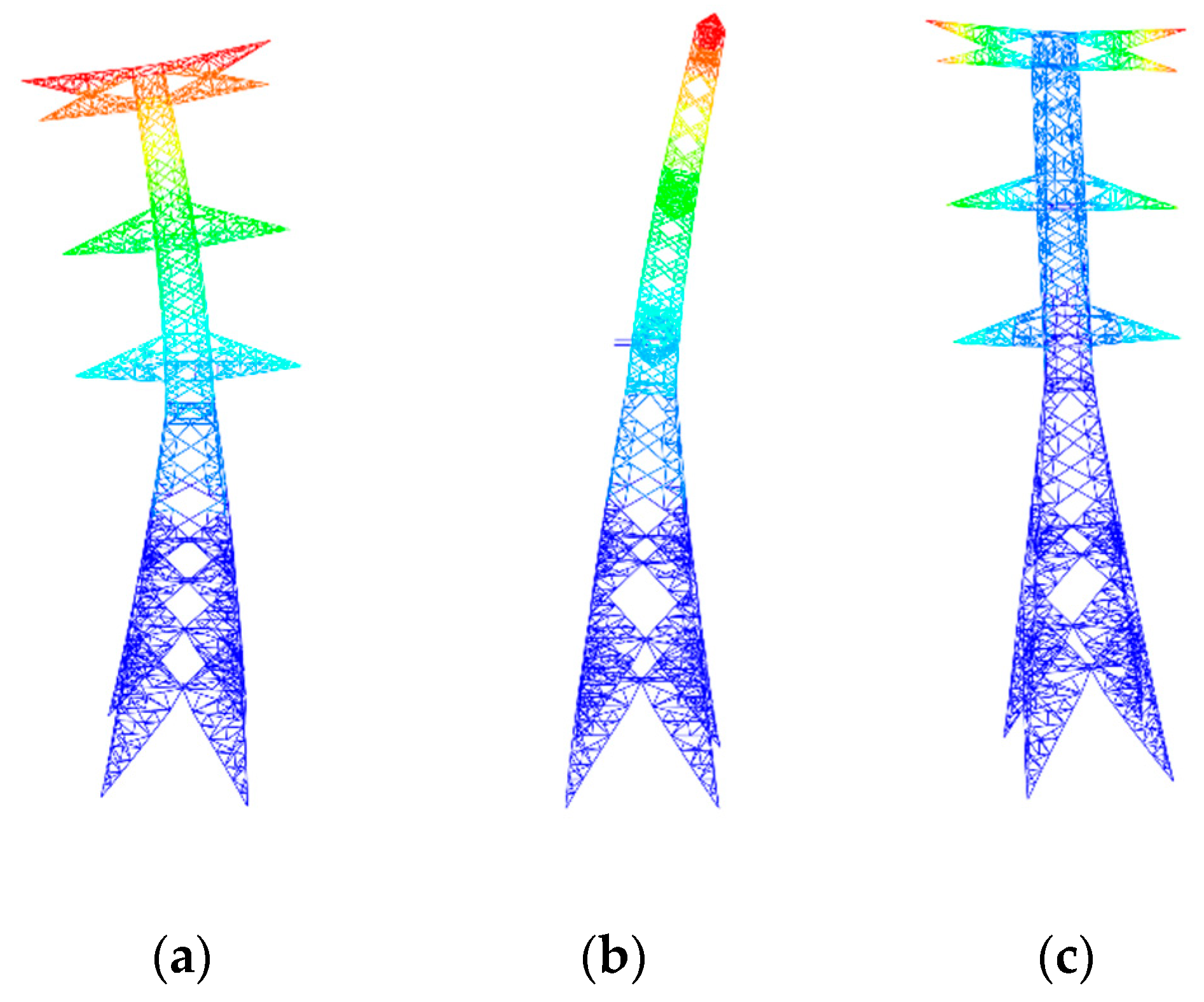 Figure 4. Modal analysis results of the transmission tower–line system. The images are listed as follows: (a) first-order mode of the transmission tower–line system, (b) second-order mode of the transmission tower–line system, and (c) third-order mode of the transmission tower–line system.