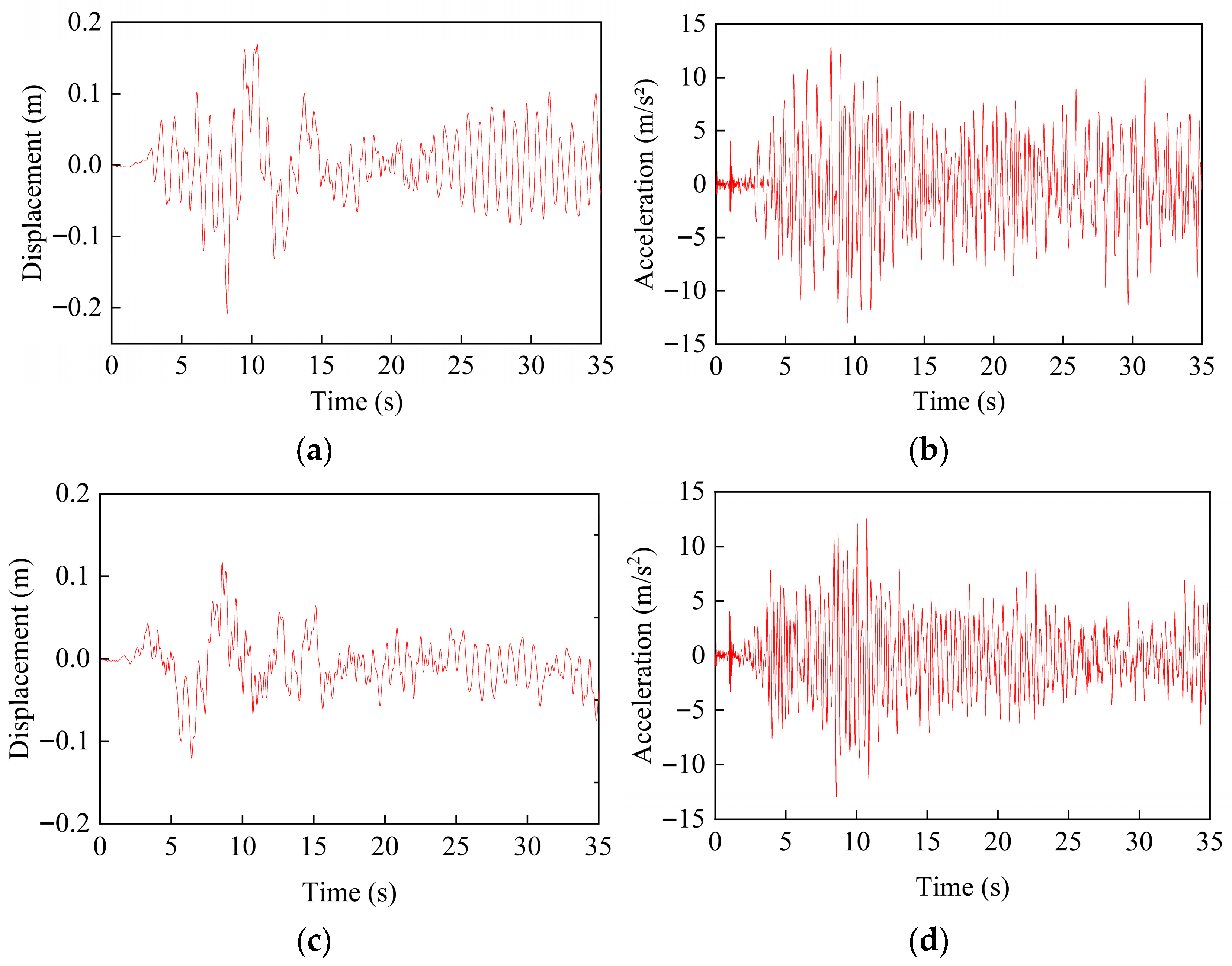 Figure 6. Time-history response of the dynamic response of the transmission tower–line system under seismic wave excitation at the top of the tower. They are listed as follows: (a) time history of tower-top displacement in the X direction under Imperial Valley wave excitation, (b) time history of tower-top acceleration in the X direction under Imperial Valley wave excitation, (c) time history of tower-top displacement in the Y direction under Imperial Valley wave excitation, and (d) time history of tower-top acceleration in the Y direction under Imperial Valley wave excitation.