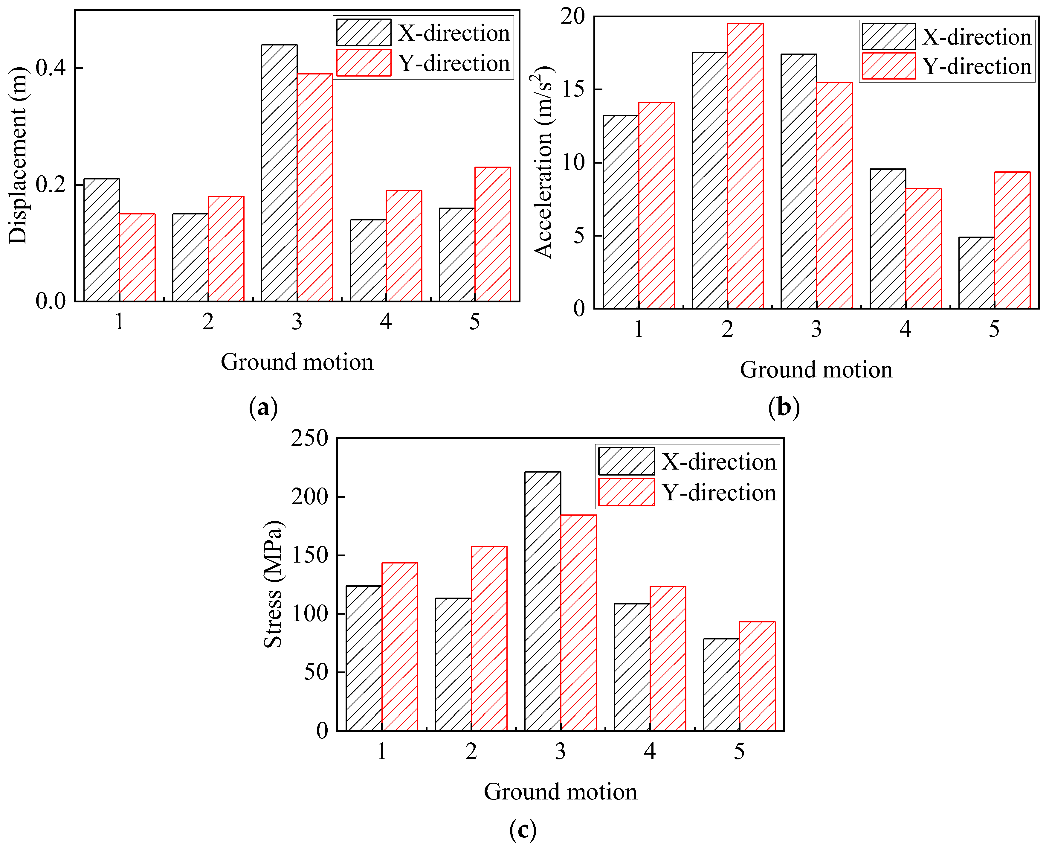 To comprehensively evaluate the dynamic response of transmission towers under different seismic excitations, a comparative analysis was conducted on the structural response. The peak displacement, peak acceleration, and peak stress of the transmission tower legs under five seismic wave excitations are listed in Table 4 and further presented in Figure 7a–c.