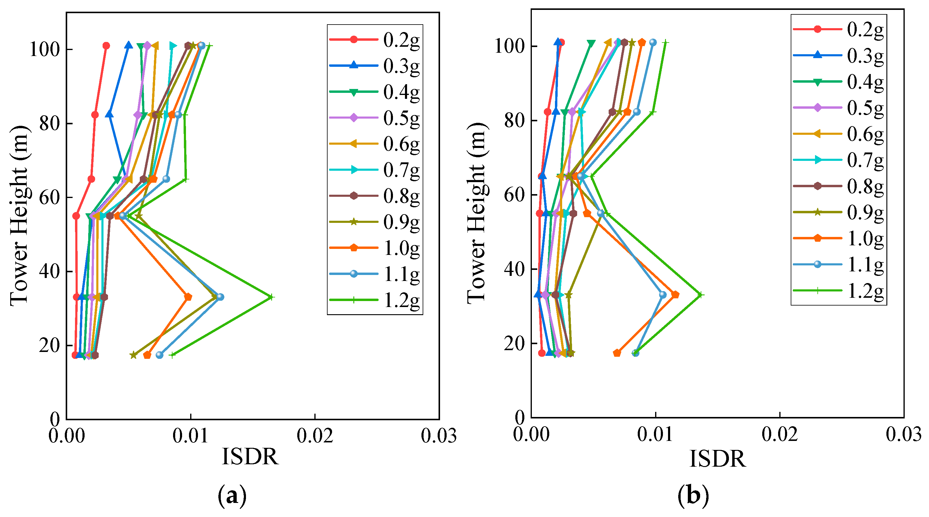 Figure 9. ISDR of the transmission tower under seismic excitation. The graphs are as follows: (a) X direction of the transmission tower and (b) Y direction of the transmission tower.