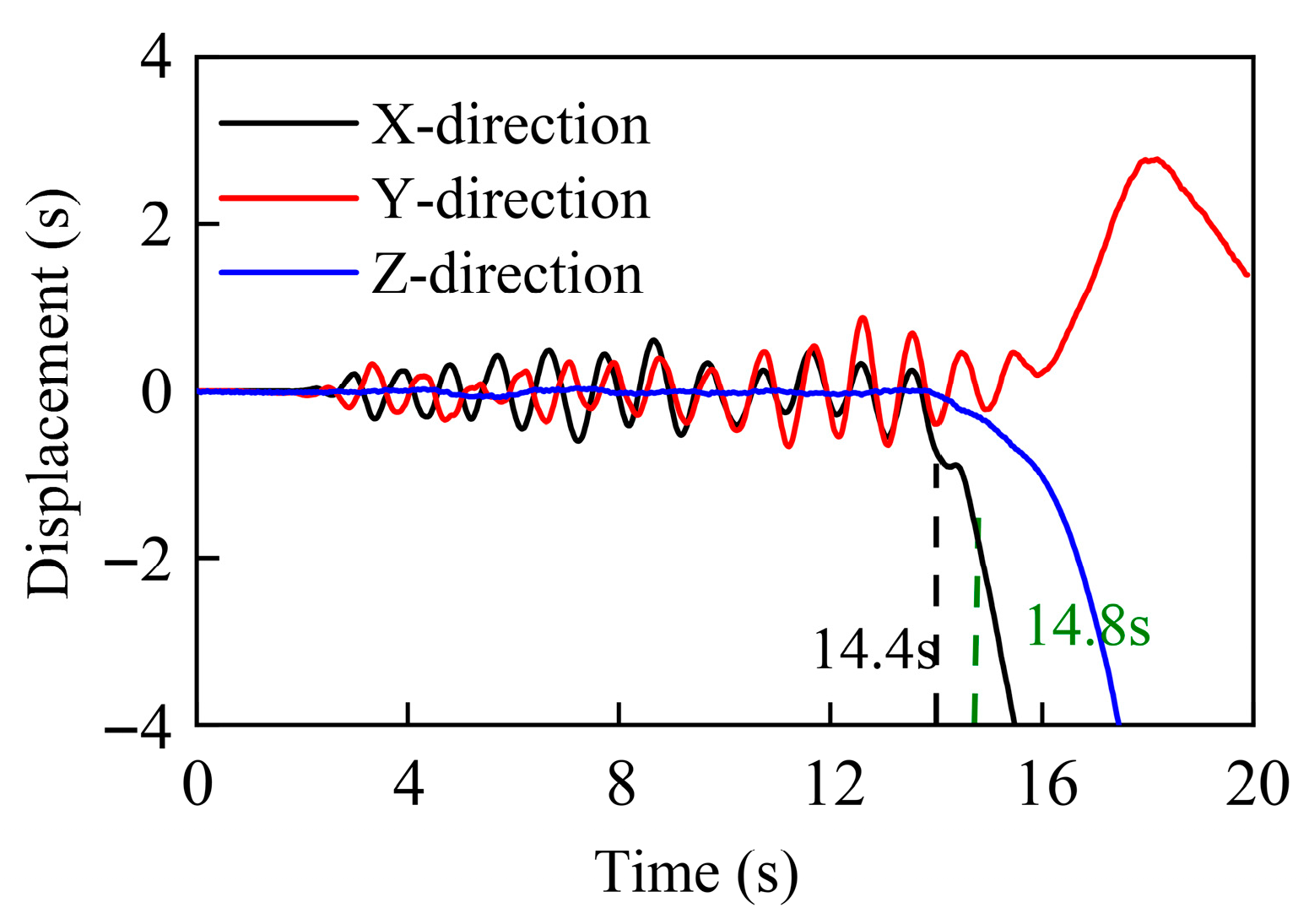 Taking GM07 as an example, Figure 10 presents the time-history curve of the tower-top displacement for the transmission tower–line system under the collapse PGA seismic excitation condition. It can be observed that in the early stage of seismic excitation, the tower-top displacement ranged from −0.738 m to 0.862 m. When the excitation time reached 14.4 s under the collapse PGA, the tower-top displacement began to exhibit a divergent trend, indicating the onset of damage in the transmission tower–line system. At 14.8 s, the ISDR of the transmission tower exceeded 2%, demonstrating that the transmission tower–line system experienced collapse failure.