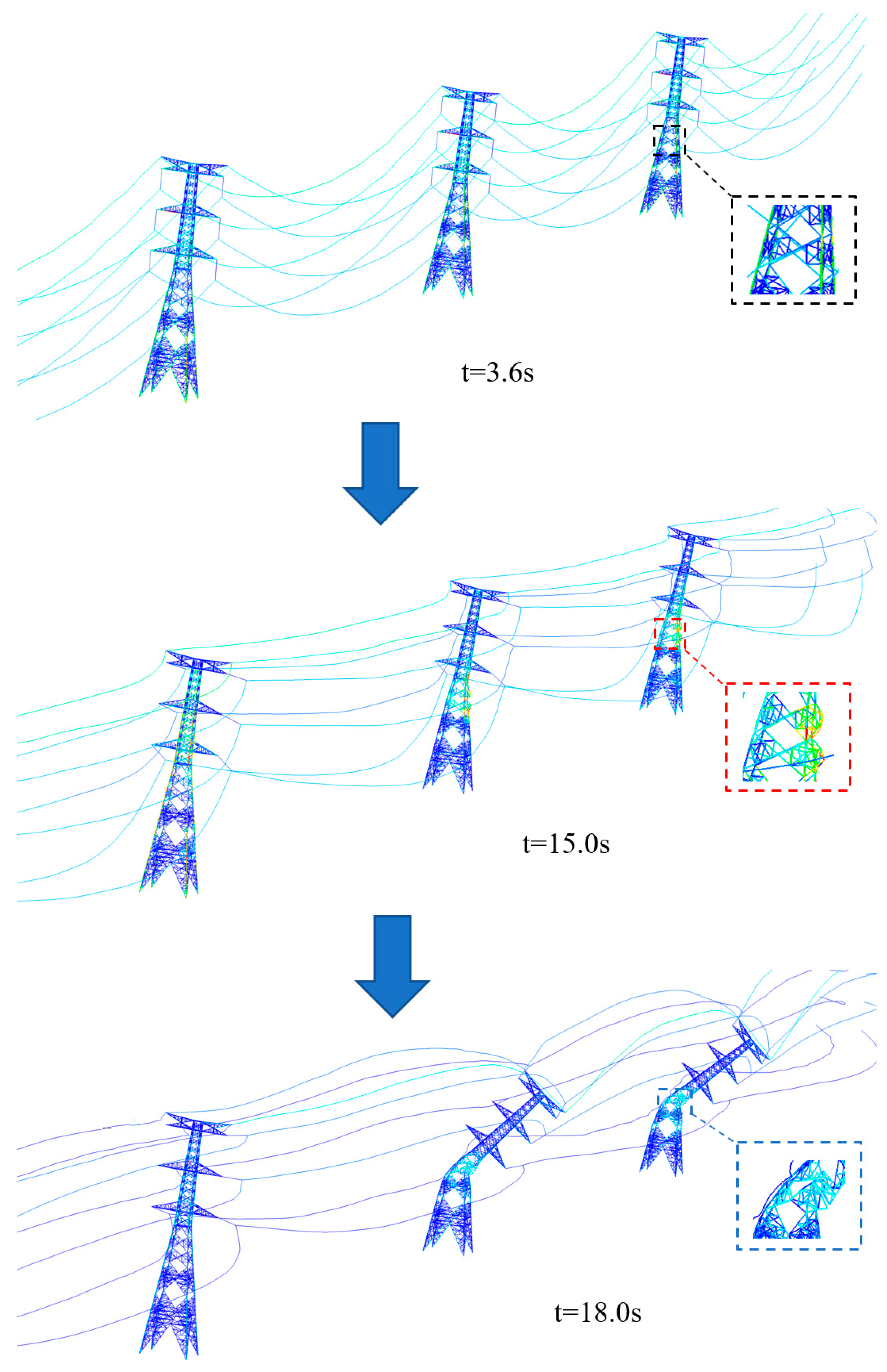 It can be observed that significant deformation occurred in the lower inter-story segments of the transmission tower, leading to the collapse failure of the tower–line system. The collapse process of the transmission tower is as follows: At t = 3.6 s, multiple diagonal members in the lower inter-story segments began to exhibit cumulative damage. By t = 15.0 s, widespread damage had developed in the diagonal, auxiliary, and cross-diagonal members within these segments. A few components reached SDV4 = 1 (complete failure), and significant global structural deformation was observed. Based on the tower-top displacement time-history curve, the transmission tower was determined to have entered a collapsing state. Subsequently, the progression of member failures accelerated. By t = 18.0 s, most members in the lower inter-story segments were severely damaged, with multiple components reaching SDV4 = 1, resulting in extensive deformation of the overall structure.