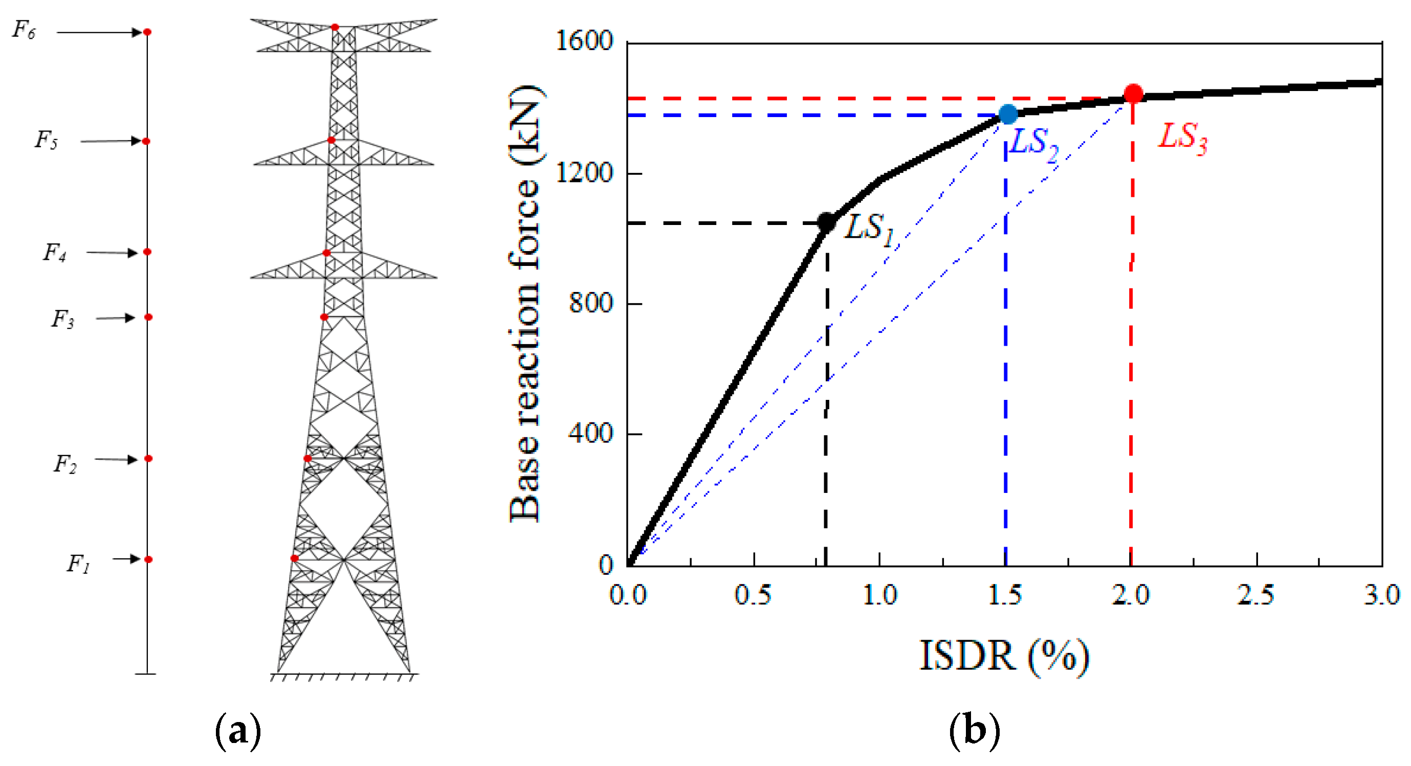 A pushover analysis was conducted on the transmission tower to obtain the relationship curve between the base shear force and the ISDR. This curve was used to determine the various limit states, thereby enabling a quantitative evaluation of the damage grades. The pushover analysis applies laterally distributed forces that incrementally increase according to a specific pattern along the height of the structure, simulating the distribution of story shear forces under seismic action. The reasonableness of the selected lateral force distribution pattern directly affects the accuracy of the pushover analysis results. For slender structures like transmission towers, the story mass can be assumed to be uniformly distributed along the height [32]. Therefore, this chapter employs an inverted triangular distribution load to apply lateral forces to the transmission tower, as shown in Figure 13. We performed a “static” pushover analysis using a fixed inverted triangular load distribution pattern. Its core characteristic is that the lateral force distribution pattern applied to the structure (defined by Equation (2) in the revised manuscript) is predetermined and remains fixed throughout the entire analysis process. The calculation formula for the lateral forces on the transmission tower is as follows: