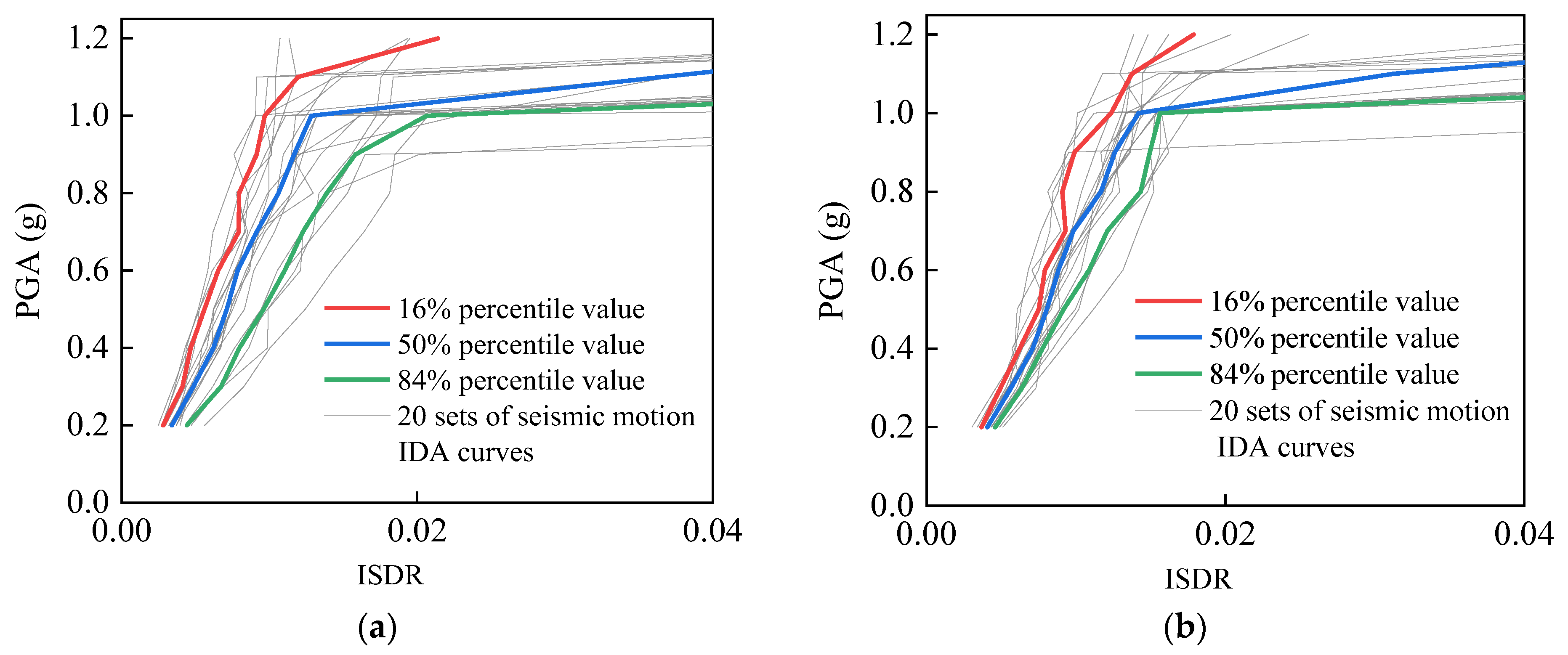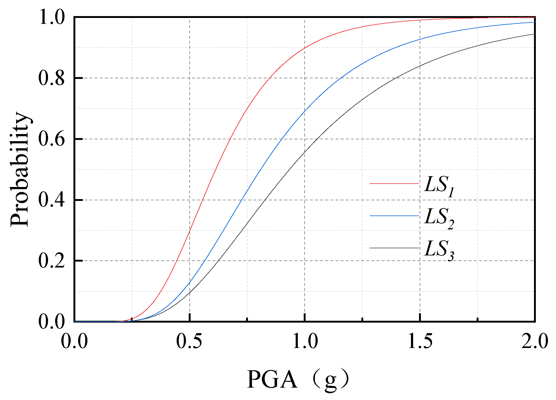 In the formula, D represents the seismic demand; C represents the structural capacity; Φ · denotes the standard normal distribution function; L S i represents different limit states; and β D and β C are the logarithmic standard deviations of the seismic demand and structural capacity, respectively. When PGA is used as the intensity measure in the seismic fragility analysis, β D 2 + β C 2 is taken as 0.5.