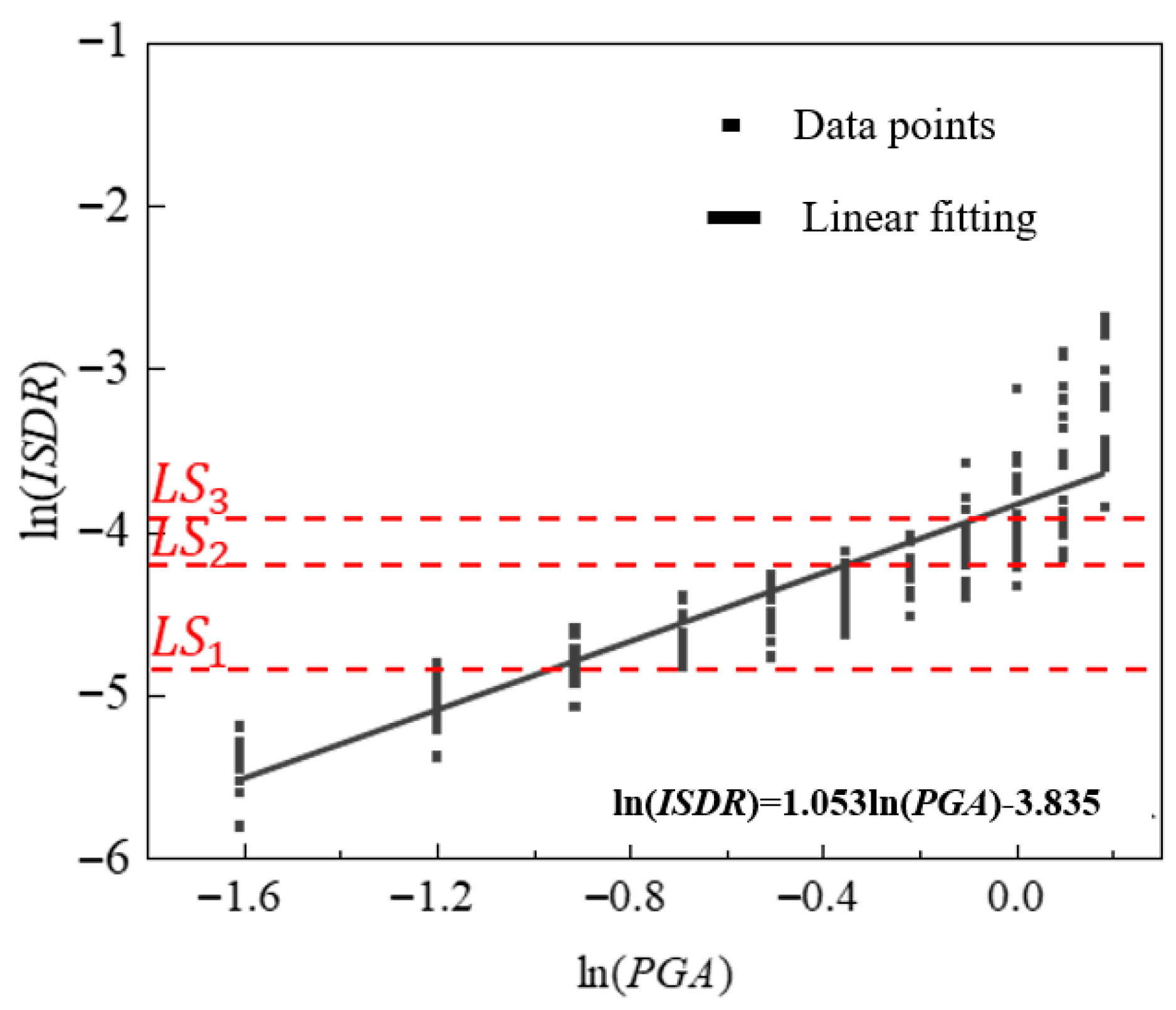 Figure 15 displays the logarithmic scatter distribution of PGA versus the ISDR for the transmission tower–line system and its linear fitting results. In the figure, each column of data points shares the same PGA value, with PGA increasing sequentially from 0.2 g to 1.2 g for different columns. The limit states LS1, LS2, and LS3 defined in Section 5.1 are set at 0.8%, 1.5%, and 2%, respectively, with corresponding logarithmic values of −4.81, −4.18, and −3.95. When the PGA is below 0.7 g, the ISDR values of the transmission tower–line system are mostly below the limit specified by LS2, indicating that the structure remains primarily in an essentially intact or slightly damaged state. In contrast, under higher seismic intensities, some data points exceed LS3. For instance, at a PGA of 1.2 g, all data points surpass the LS3 limit, indicating that the structure has undergone significant deformation and is in a state of severe damage or collapse. Moreover, as the seismic intensity increases, the dispersion of the inter-story drift angles gradually widens. For example, the distribution range of drift angles at a PGA of 1.2 g is noticeably larger than that at 1.0 g, further reflecting the enhanced nonlinear response and more pronounced variability in deformation capacity after the structure enters the plastic stage. Linear regression of ln(PGA) against ln(ISDR) yields fitting coefficients a and b of 1.053 and −3.835, respectively.