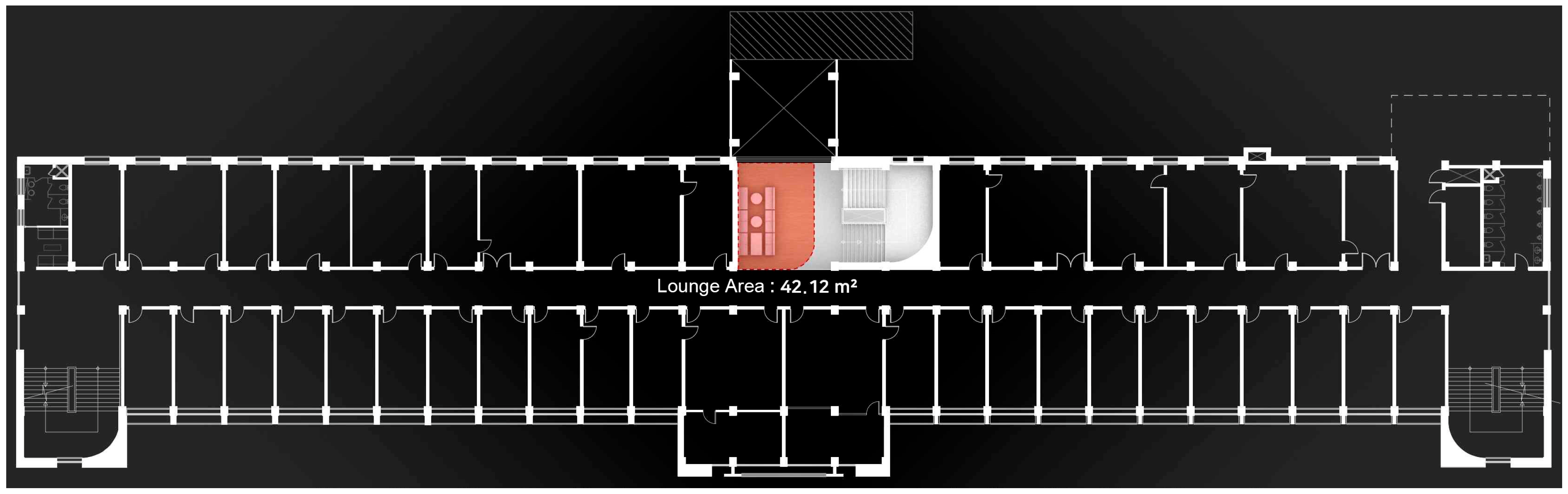 - Design B: The lounge with partially open partition furniture that delineates territory while retaining outward visibility to corridors and stairwells.
