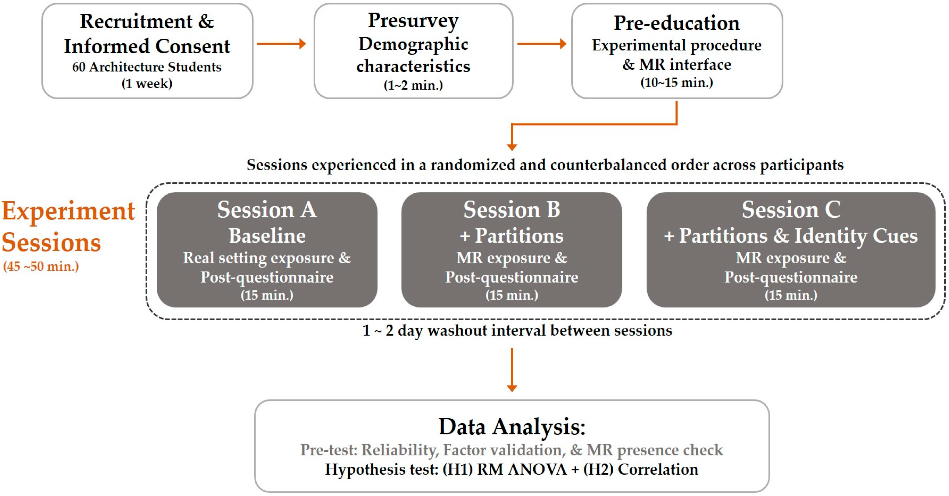 - H1 (between-design differences): The three lounge designs—(A) baseline, (B) A + virtual spatial partition, and (C) B + virtual identity cues—produce significantly different mean scores for PTC and SOC.