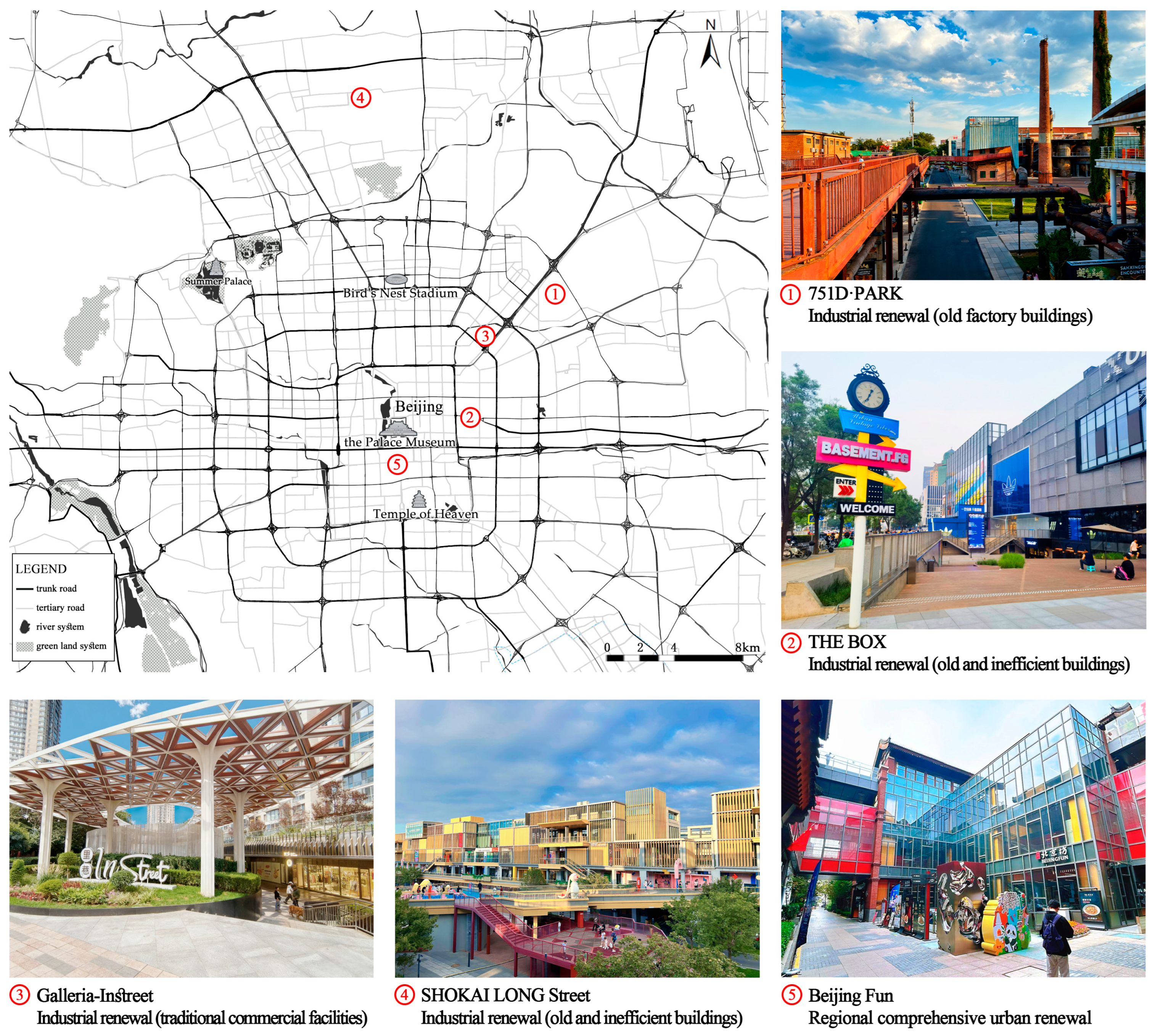 - Pan, F.; Huang, Z.; Xing, Y.; Li, R. Analysis of Trends and Strategic Suggestions for Beijing’s Business District Reconstruction in the Context of Urban Regeneration. World Archit. 2023, 04, 21–25. [Google Scholar] [CrossRef]