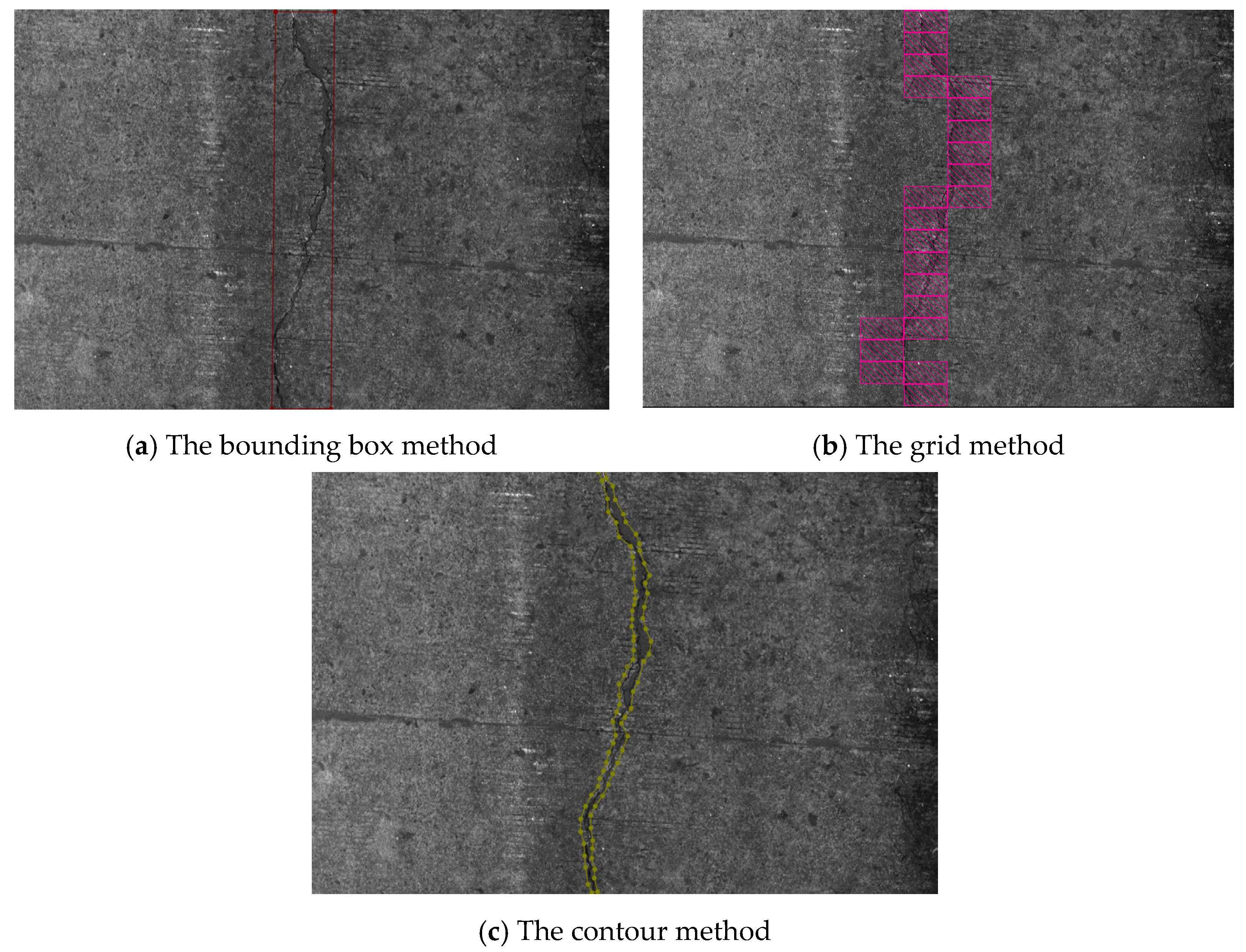 | Bounding box method | Asphalt pavement | Longitudinal cracks | 4000 | 3792 | 123 | 85 | 94.79% | 4.07% | 2.87% |
