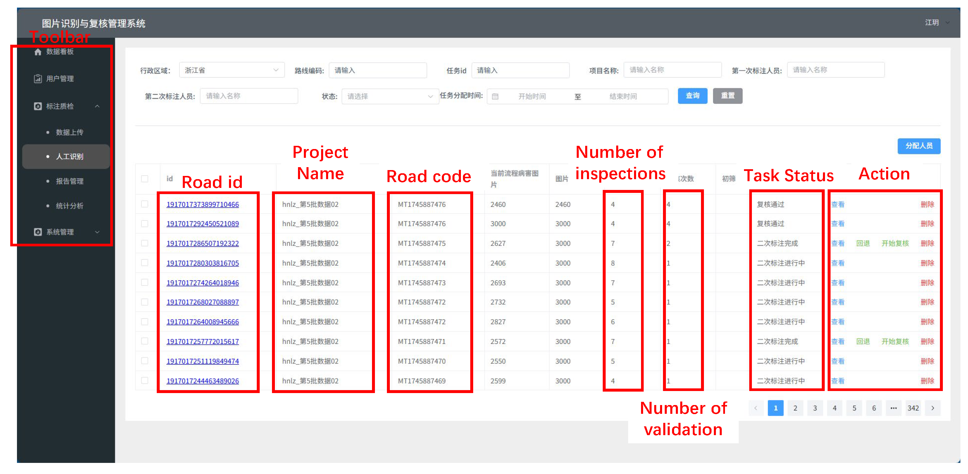 | Annotation Method | Road Type | Distress Type | Sample Images | Accuracy | False Detection | Missed Detection | Accuracy (%) | False Detection Rate (%) | Missed Detection Rate (%) |