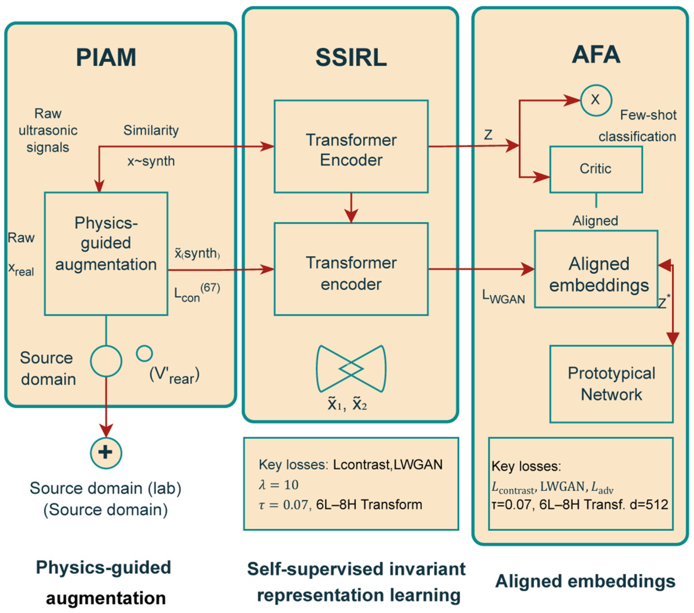 46]. Building on these advances, the present framework unites both paradigms within a physics-consistent environment, where self-supervised pretraining operates on a mixture of real and PIAM-simulated signals. This dual-source training strategy yields embeddings that are both data-efficient and physically robust, ensuring stable performance even in extreme one-shot conditions.