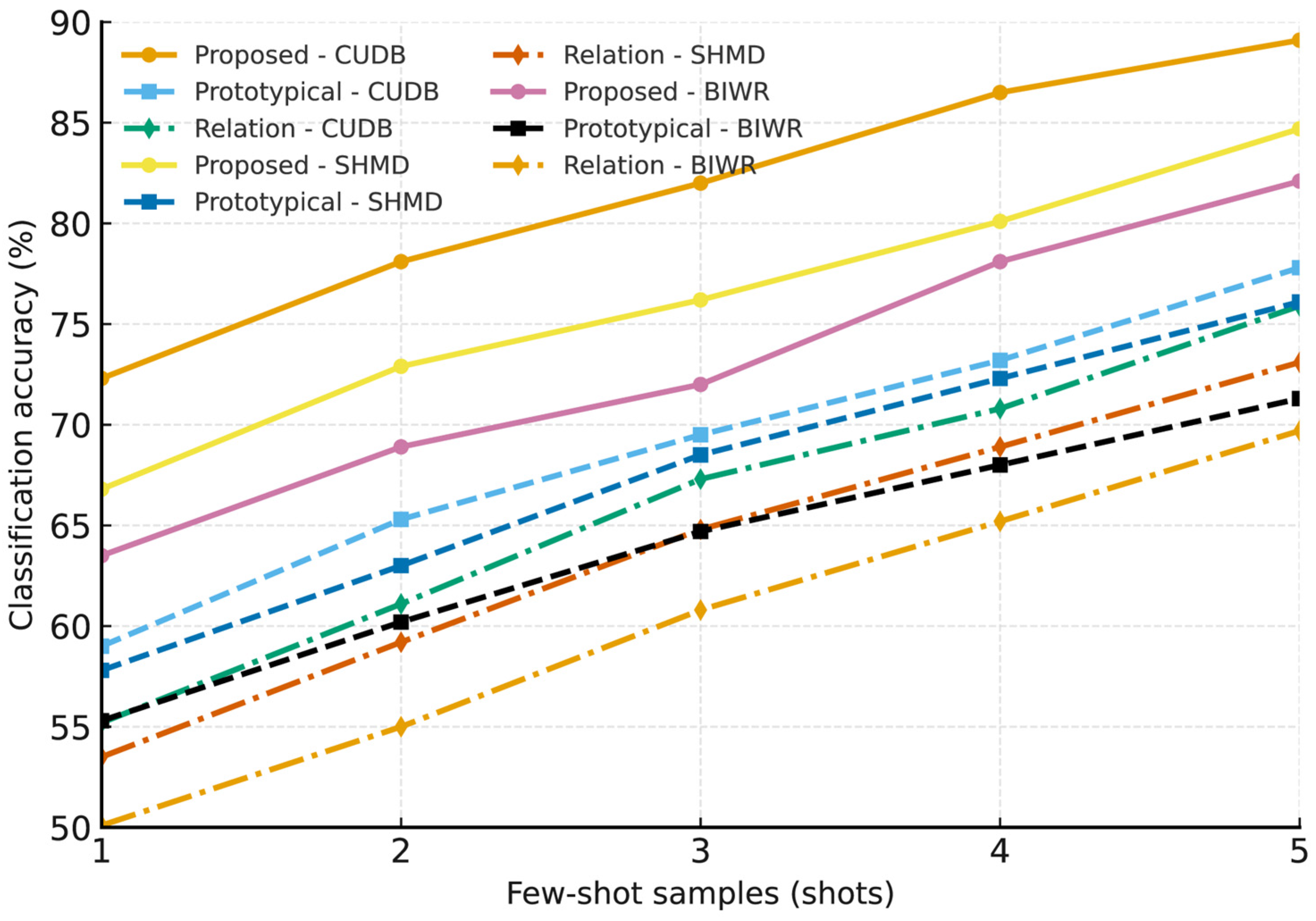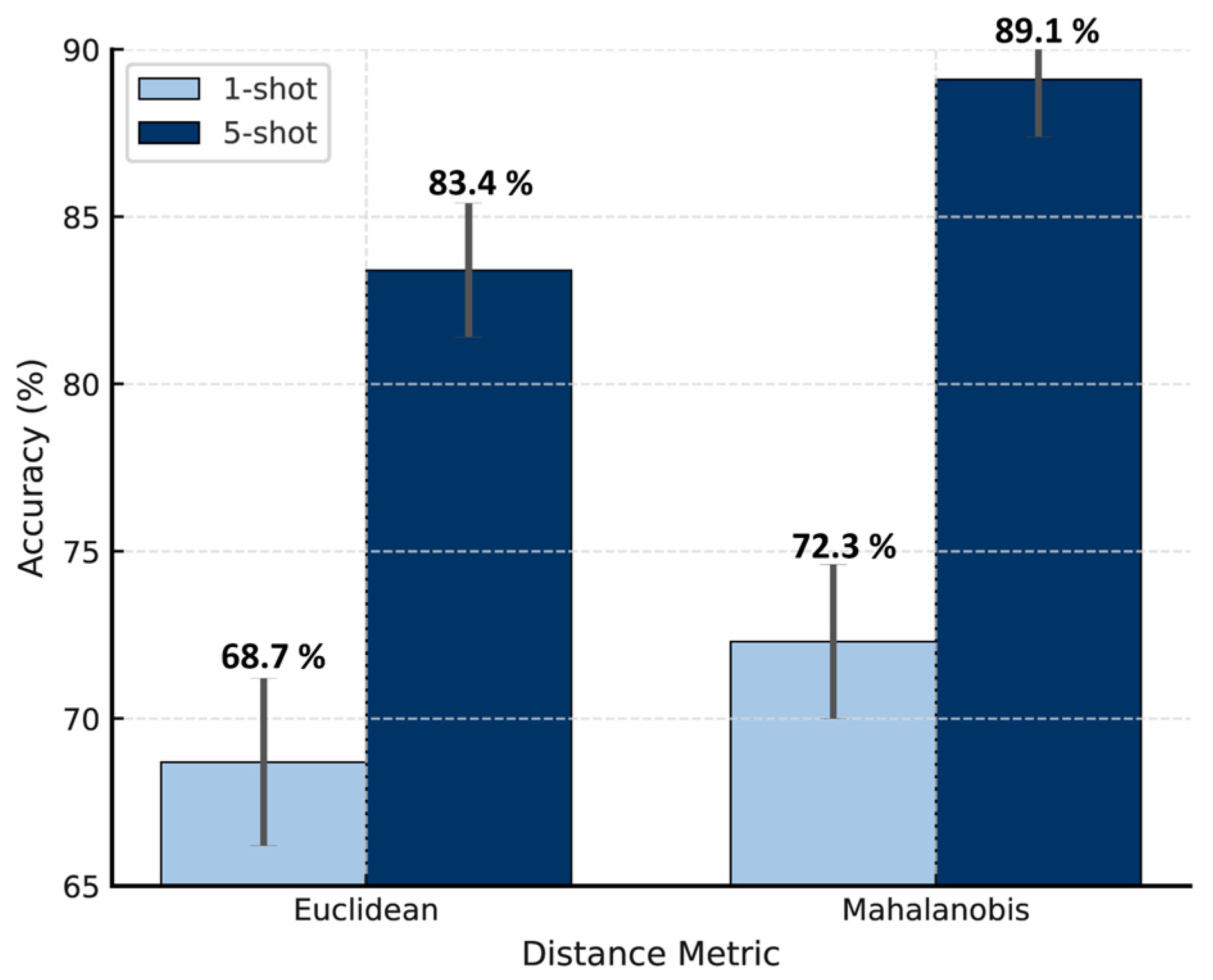 From an engineering perspective, the demonstrated one-shot and few-shot capabilities have profound operational advantages. Achieving more than 60% accuracy with a single labeled sample means that inspectors can perform rapid pre-screening of large structures using minimal calibration data. When five labeled examples per defect type are available, accuracy surpasses 85%, making the system suitable for semi-automated assessment in maintenance workflows.