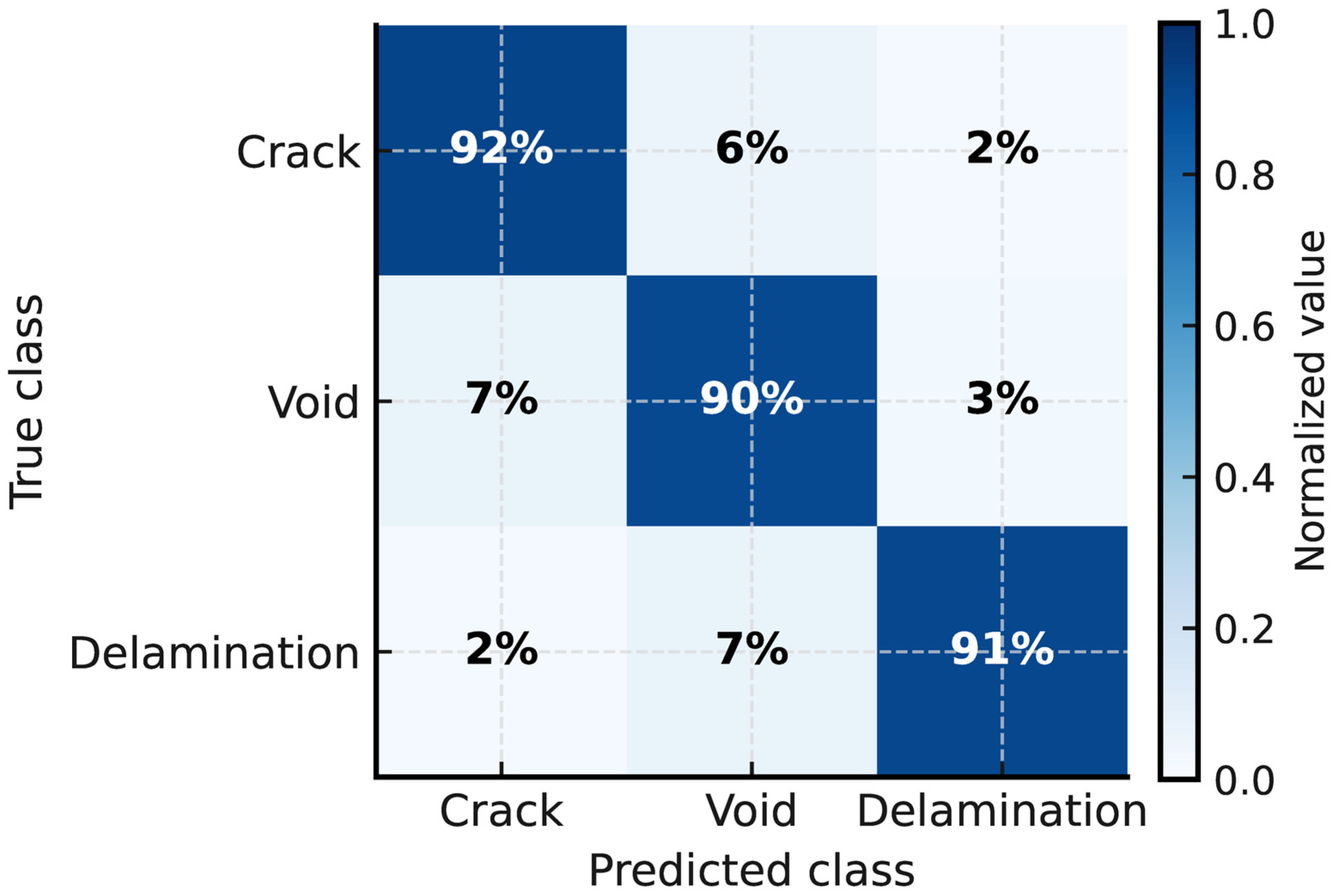 53]. In addition, the probability-based outputs (e.g., Crack: 94%, Void: 4%, Other: 2%) provide intuitive diagnostic feedback that engineers can integrate with traditional confirmatory tests such as coring, rebound-hammer, or ground-penetrating radar measurements.