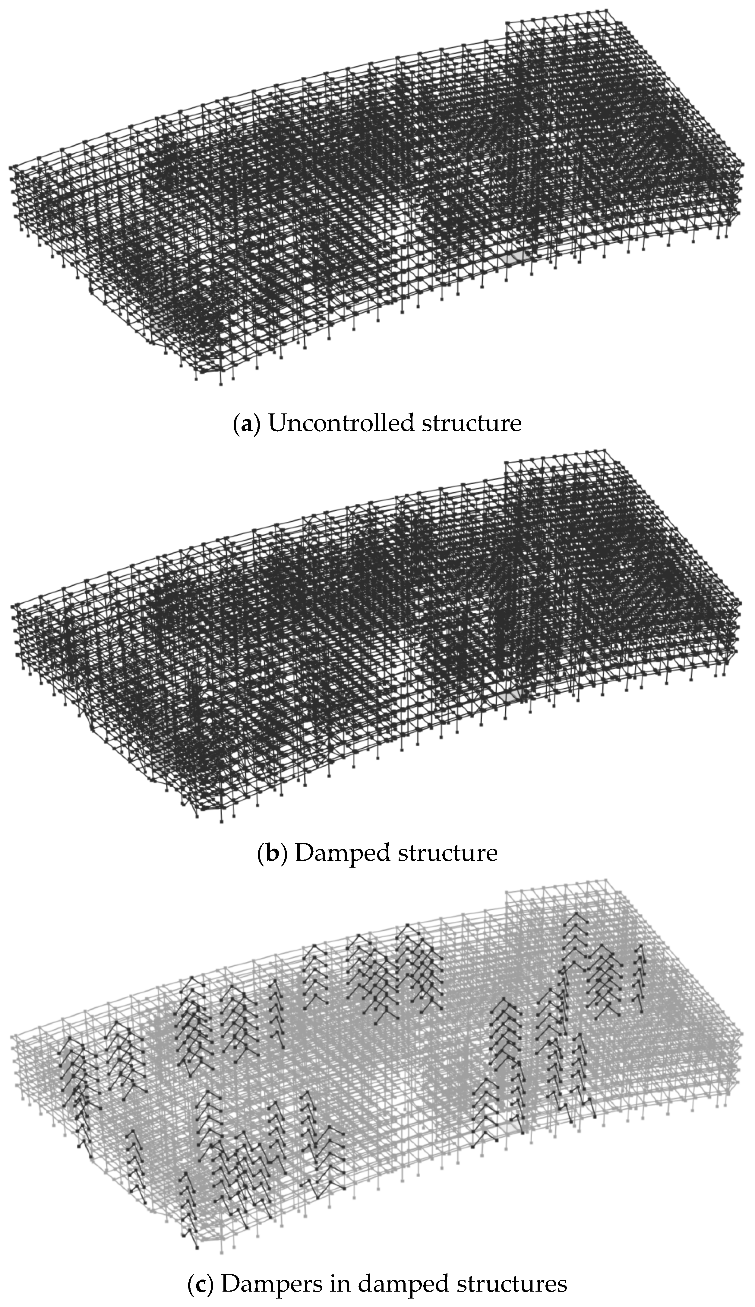 Figure 1), 32 viscous dampers were installed in the X-axis direction, and 42 metal dampers were installed in the Y-axis direction. The types and parameters of the dampers are shown in
