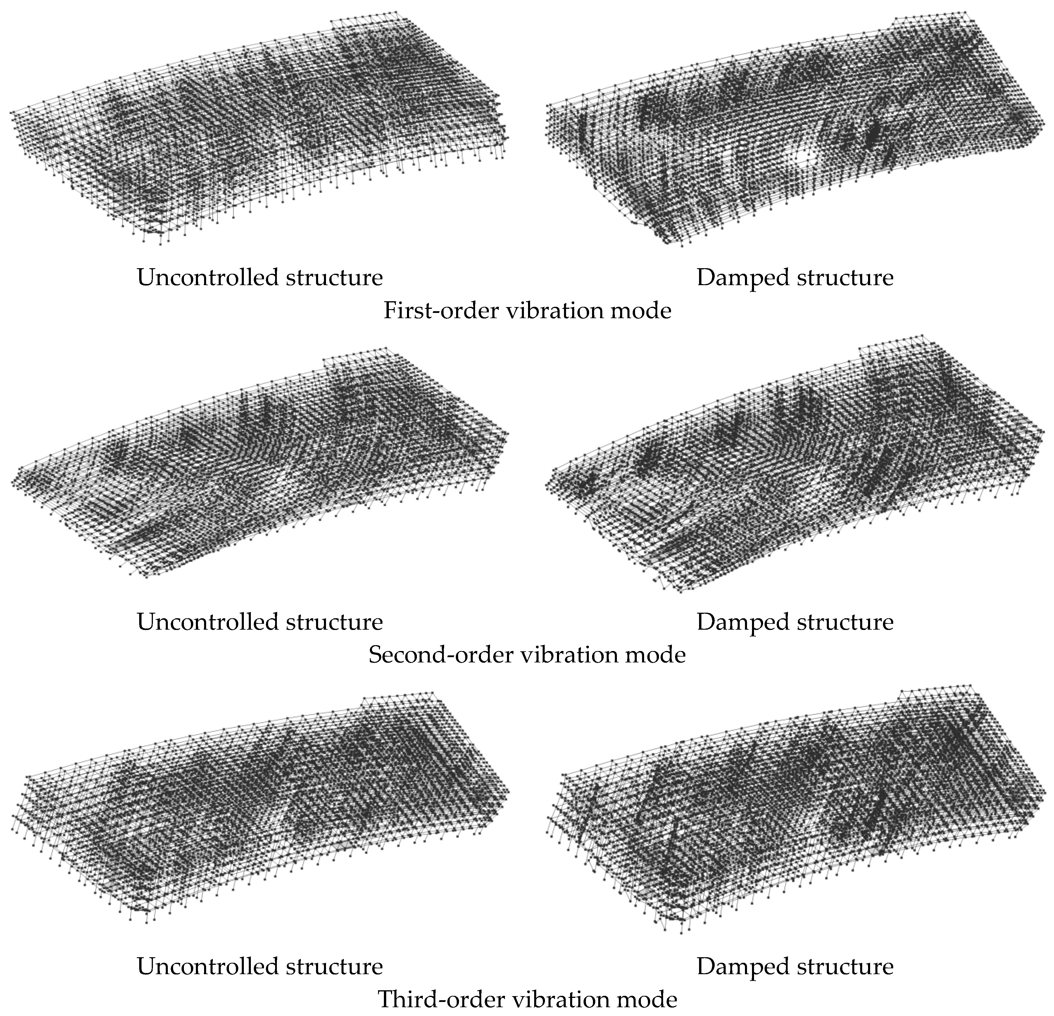 Figure 4, the natural periods of the uncontrolled structure are 1.093 s, 1.027 s and 0.8626 s, the natural periods of the damped structure are 1.061 s, 1.010 s and 0.65 s. the mode shapes for the uncontrolled structure and damped structure were identified as translational modes in the X and Y directions and torsional modes. The structural vibration patterns were similar, with the ratios of the torsional mode to the translational mode are 0.79 and 0.61, respectively (
