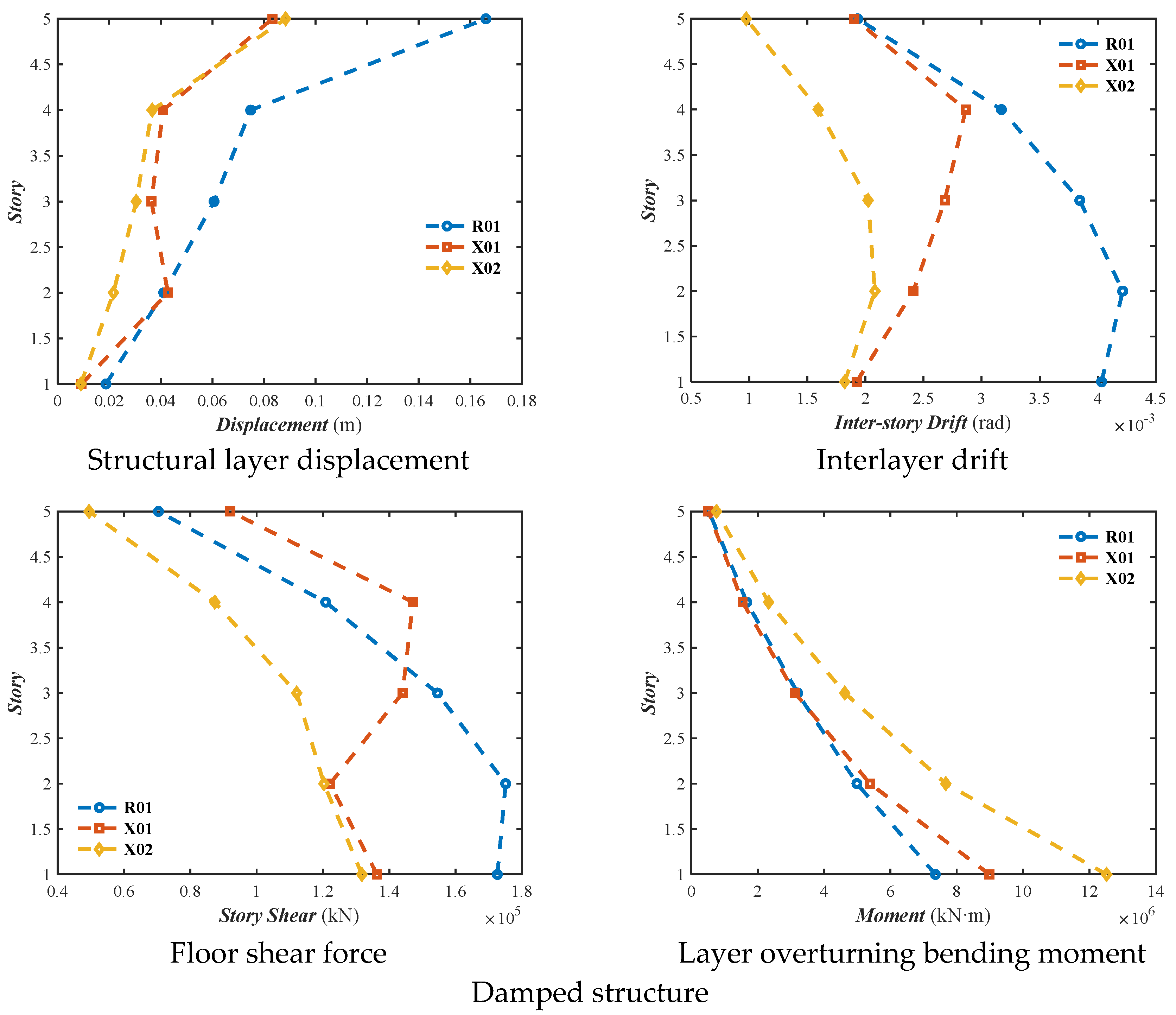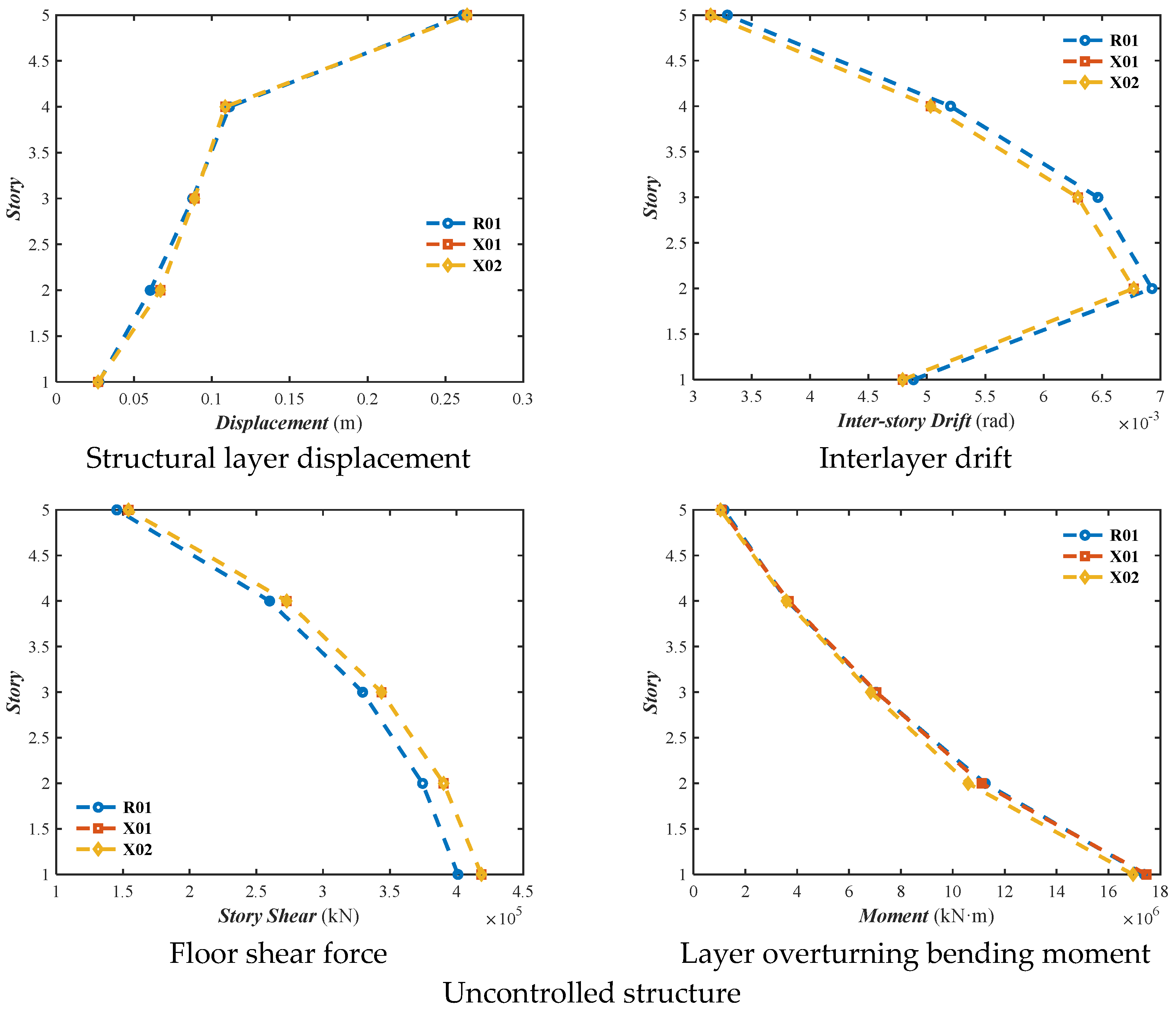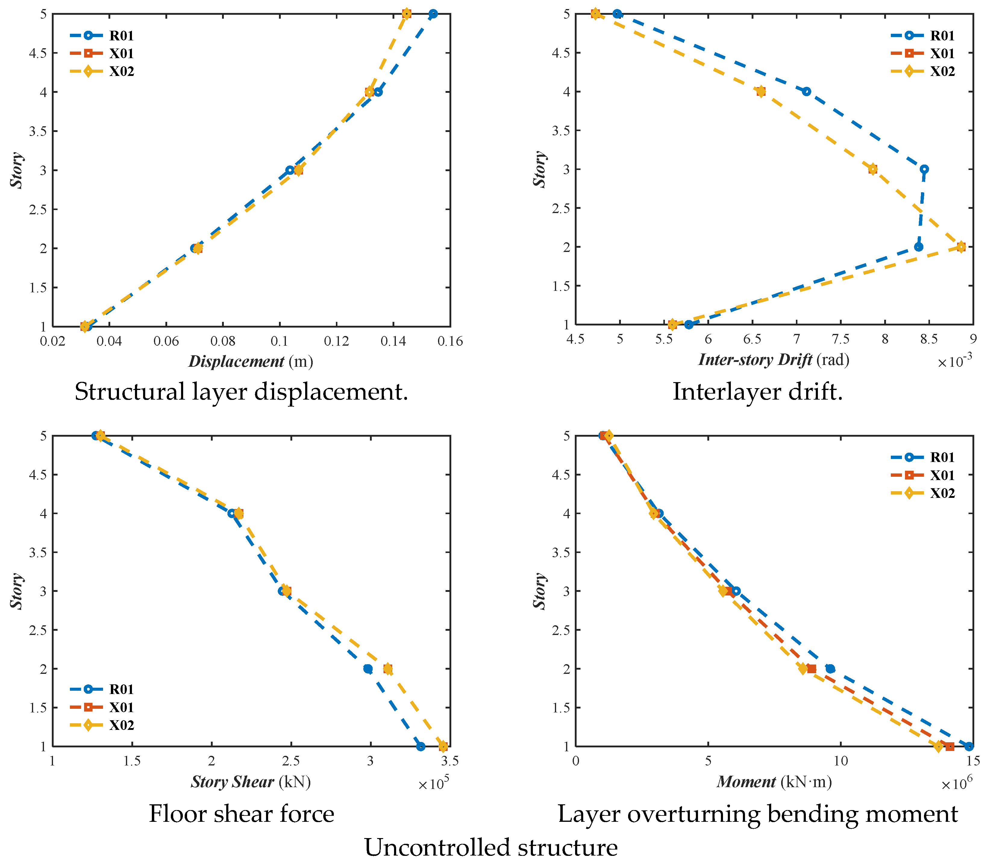 In the analysis result legend, R01, X01, and X02, respectively, represented the dynamic elastoplastic response results of the structure under the excitation of artificial wave 01, natural wave 01, and natural wave 02.