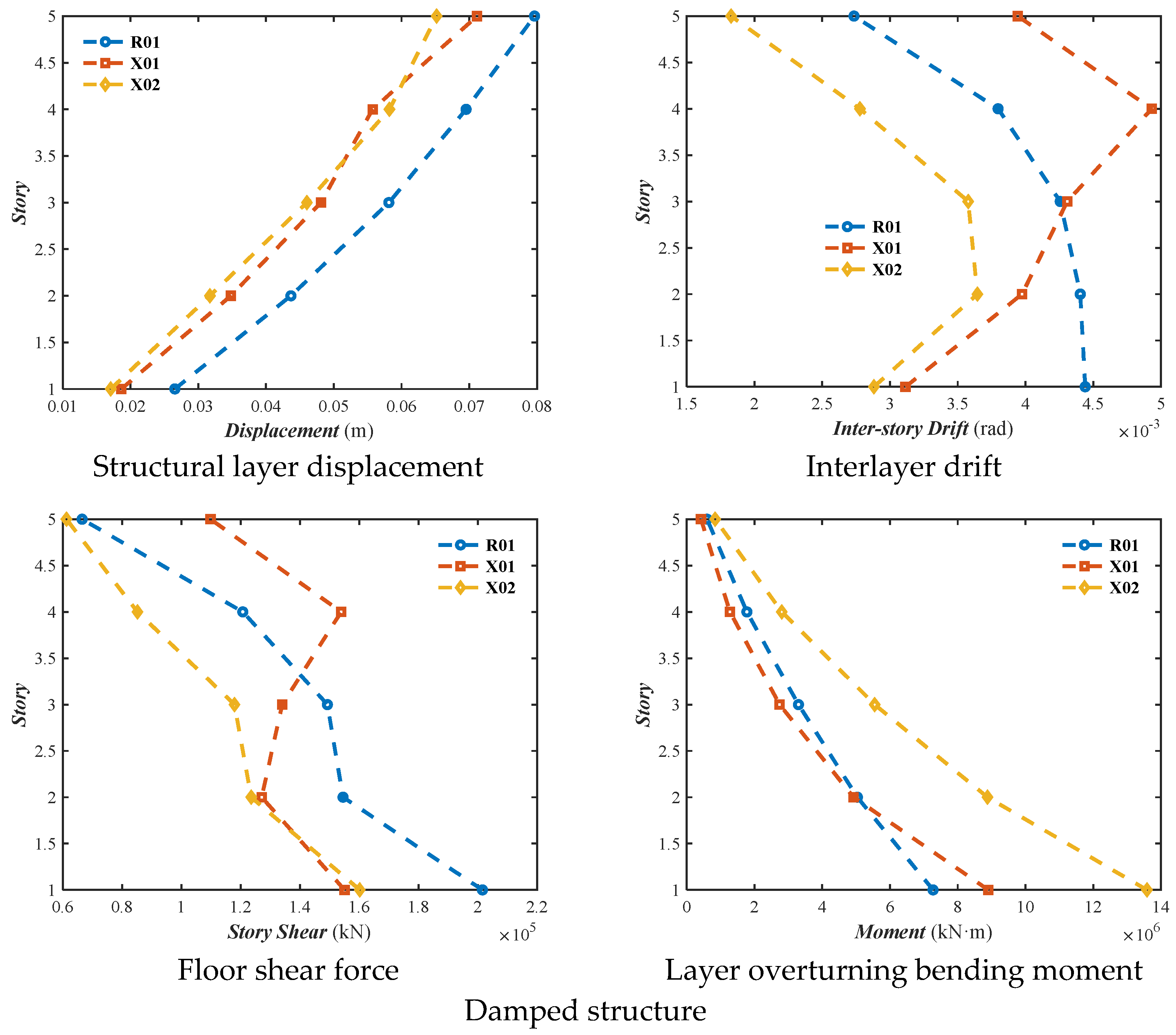 Figure 5, the displacement of the unreinforced structure in the X direction was 0.2639 m, the displacement angle was 0.0069 radians, the inter-story shear force was 418,684.5625 kN, and the inter-story bending moment was 17,468,468 kN·m. The damped structure’s displacement was 0.1660 m, the displacement angle was 0.0042 radians, the inter-story shear force was 172,598.9219 kN, and the inter-story bending moment was 12,516,883 kN·m. The displacement angles calculated for all three seismic motions were less than 1/50, satisfying the code requirements. The inter-story displacement reduction reached 37.09%, the shear force reduction was 58.78%, the bending moment reduction was 28.35%, and the displacement angle reduction was 39.16%. These results indicate that the hybrid control technology in the X direction significantly improved the structural dynamic response.