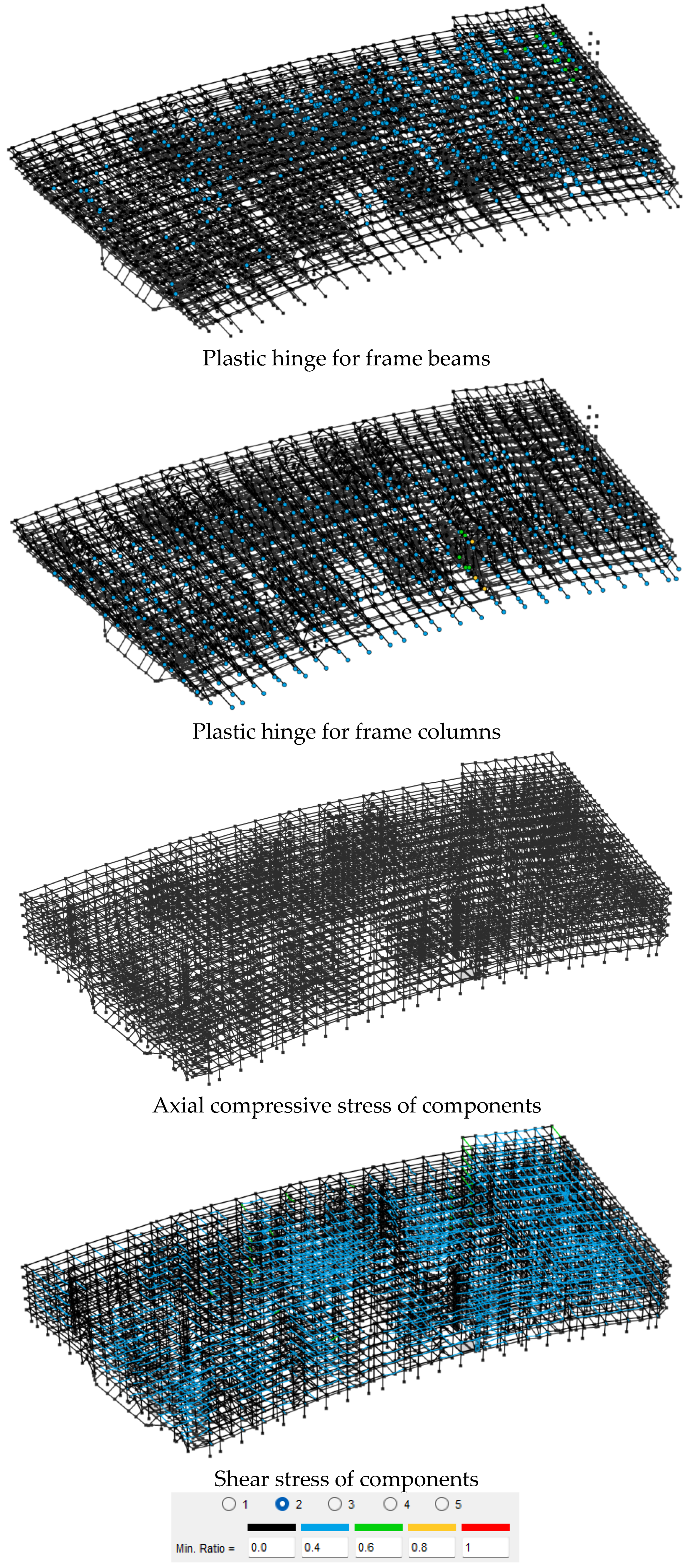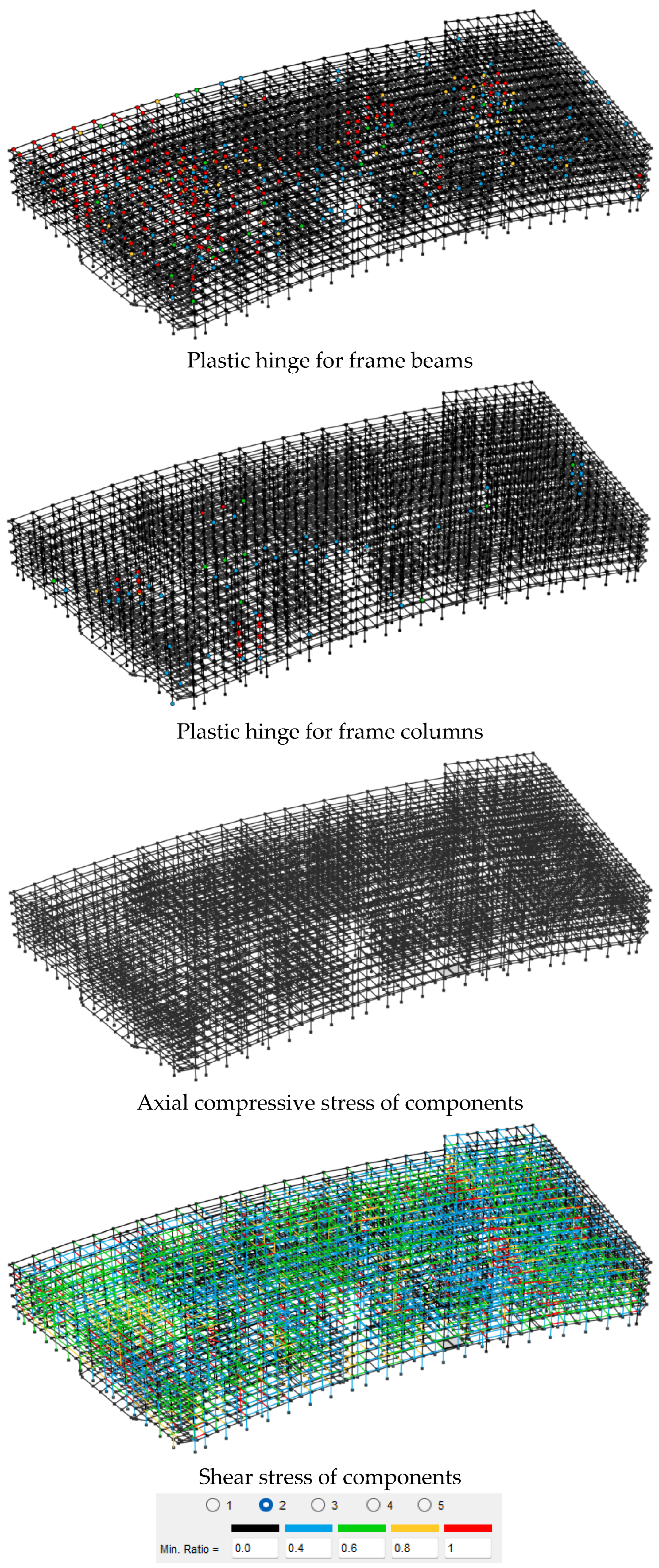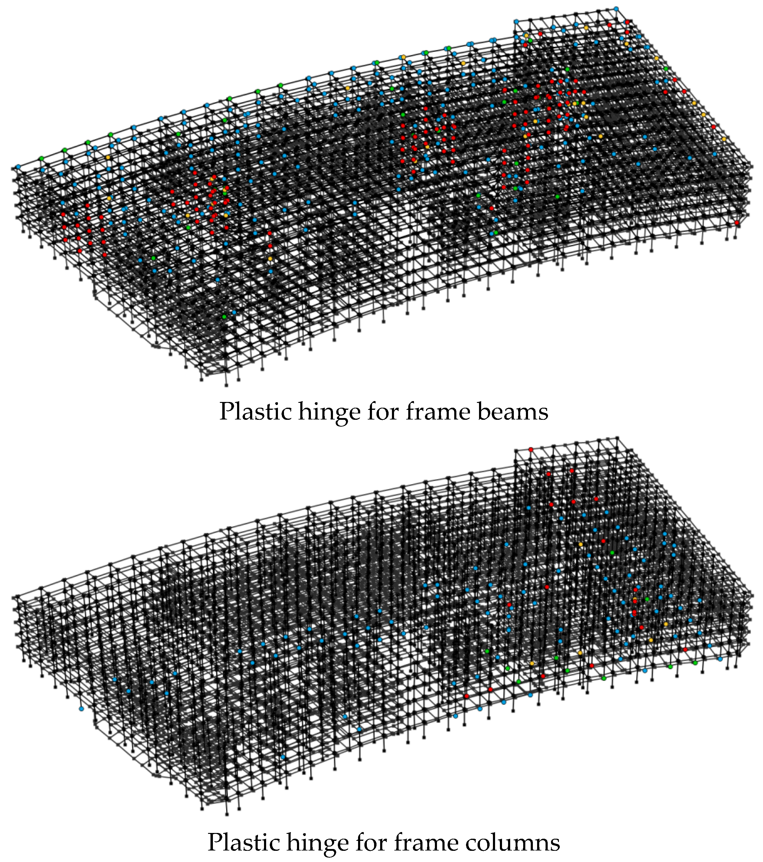 Figure 8, the plastic hinge distribution in the frames of the uncontrolled structure was concentrated in the central regions, with higher damage levels in the upper-floor frame beams. The axial compressive strain of the members did not exceed the ultimate compressive strain, while the shear stress levels were relatively high, mainly concentrated in the upper regions. Compared to the unreinforced structure, the damped structure exhibited an overall improvement in damage levels, with lower degrees of plastic hinge damage in the frames, as well as reduced axial compressive strains and shear stress levels in the members.