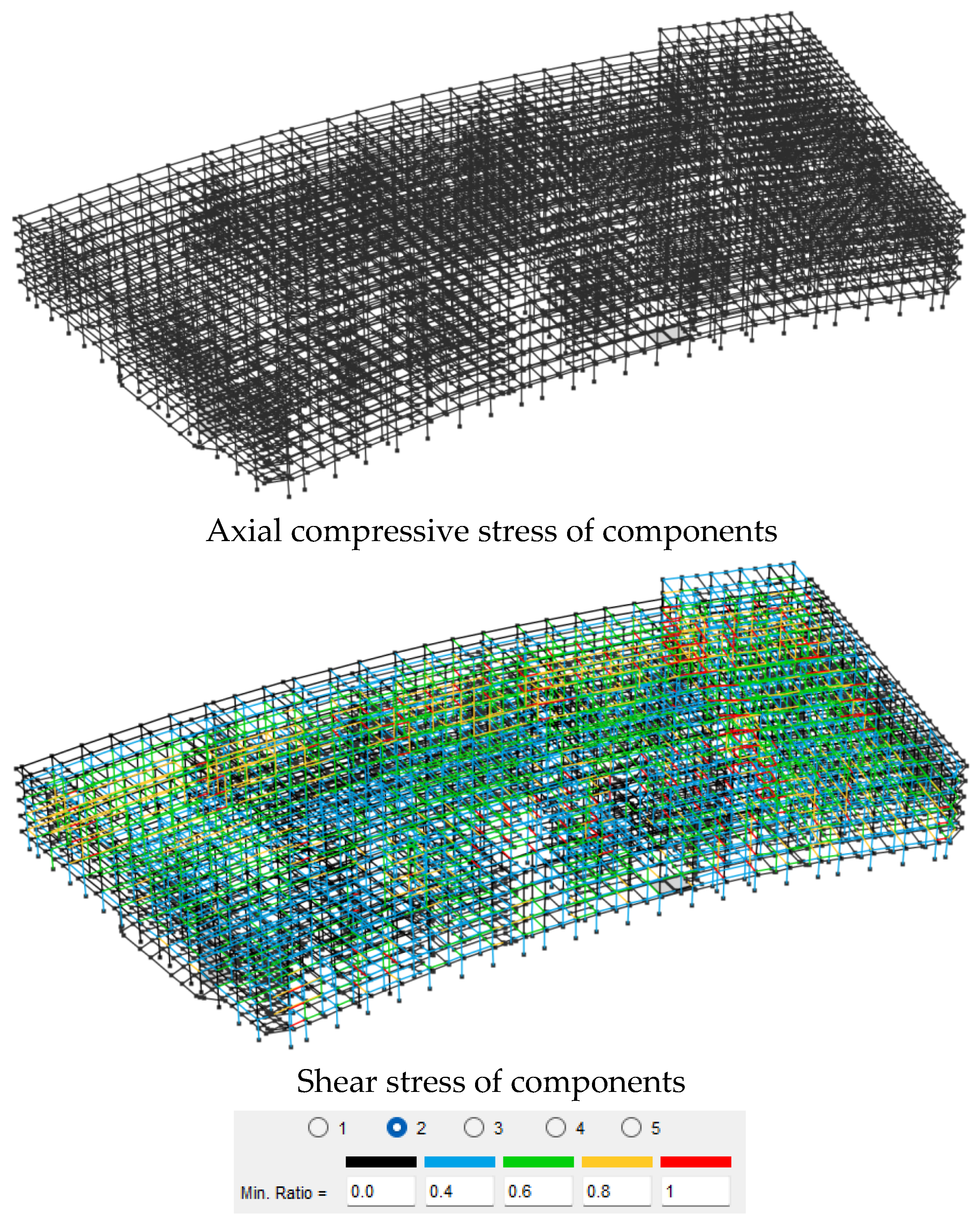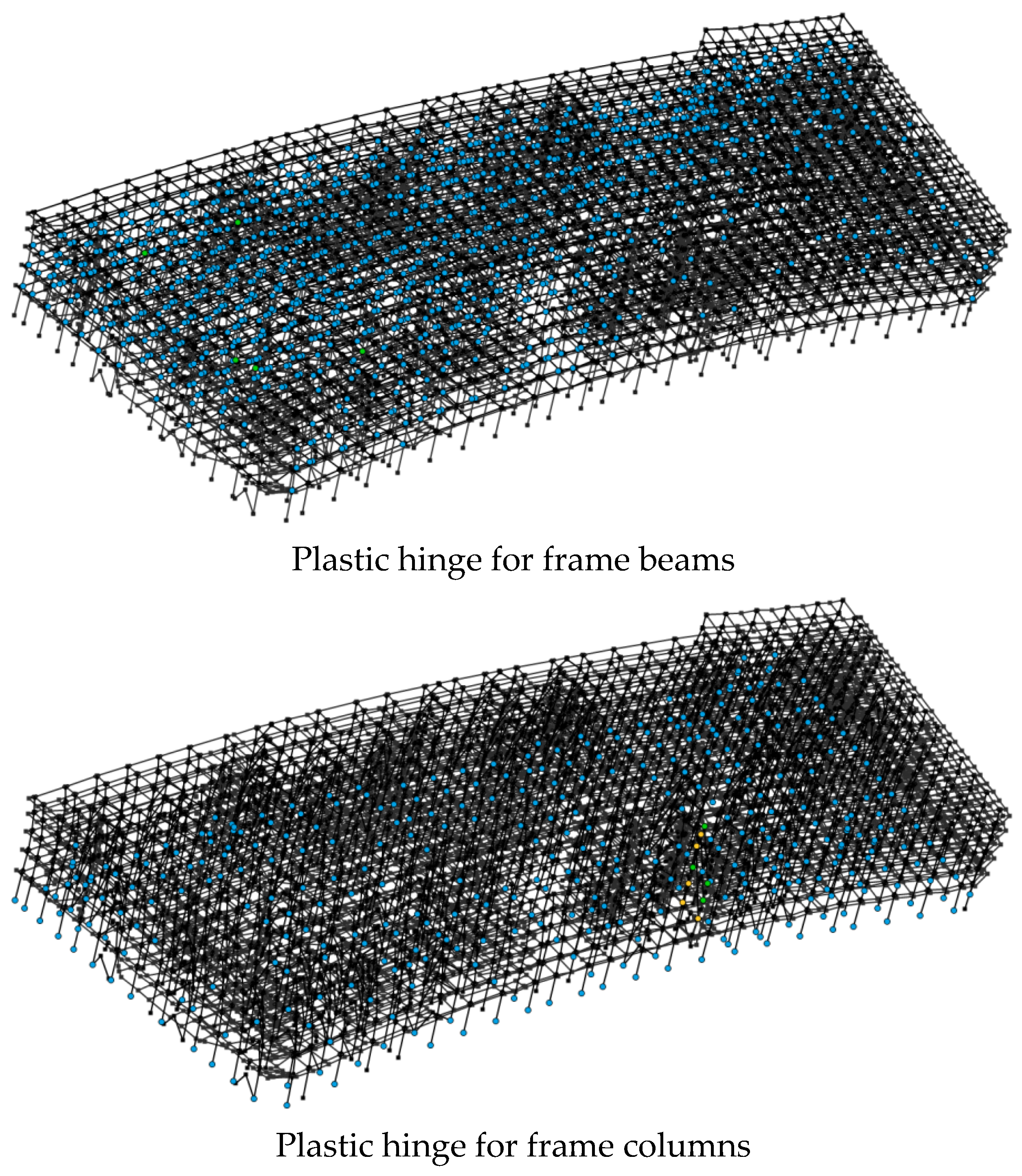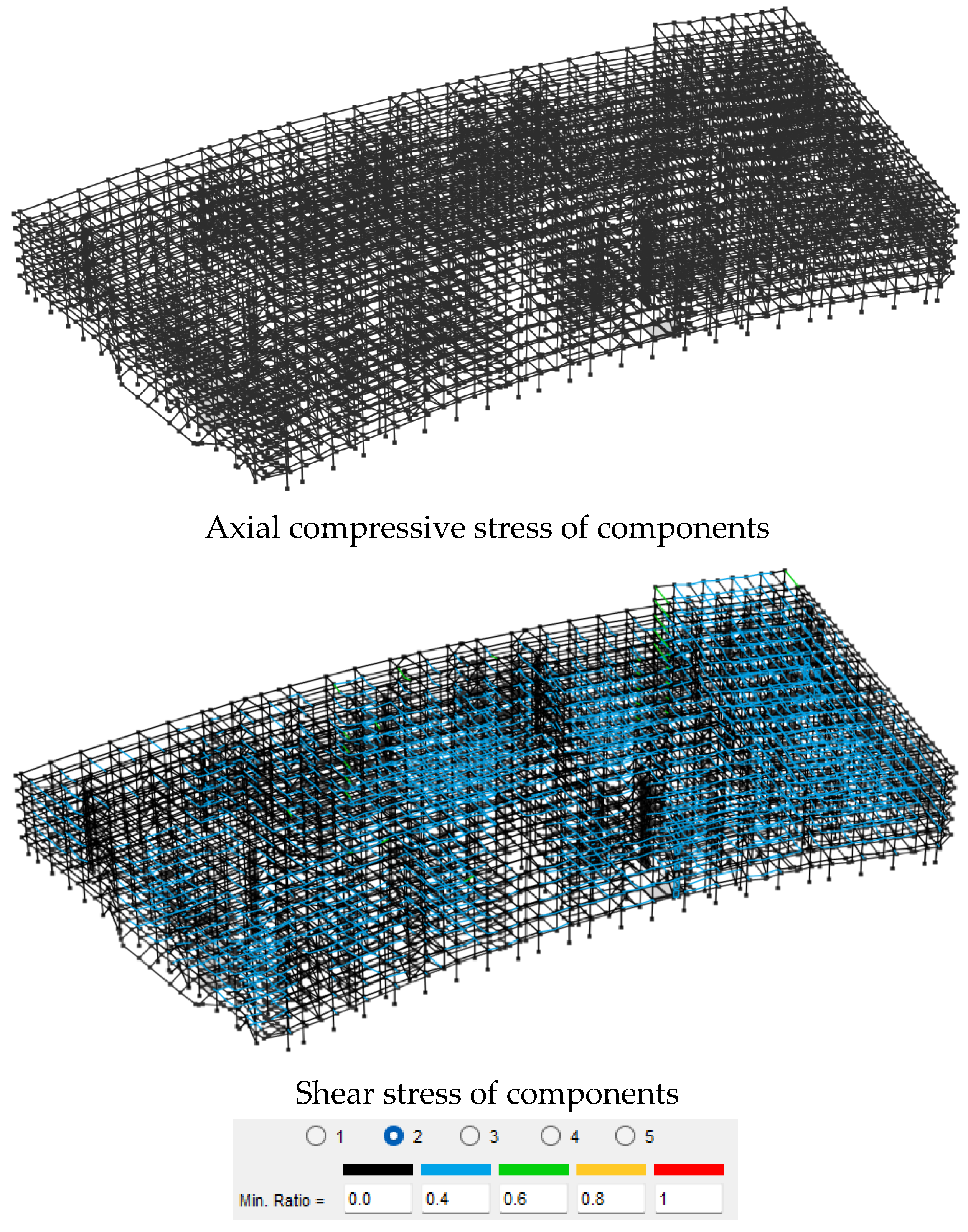 Figure 8, the plastic hinge distribution in the frames of the uncontrolled structure was concentrated in the central regions, with higher damage levels in the upper-floor frame beams. The axial compressive strain of the members did not exceed the ultimate compressive strain, while the shear stress levels were relatively high, mainly concentrated in the upper regions. Compared to the unreinforced structure, the damped structure exhibited an overall improvement in damage levels, with lower degrees of plastic hinge damage in the frames, as well as reduced axial compressive strains and shear stress levels in the members.