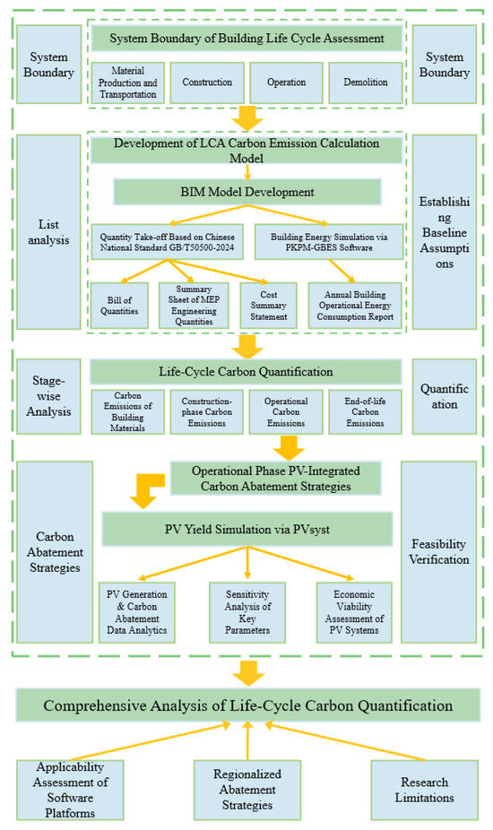 In summary, although current research on life-cycle carbon emission assessment in buildings has established fundamental methodologies, significant limitations remain: most assessment models fail to deeply integrate dynamic building information flows, resulting in fragmented data and insufficient accuracy. At the same time, quantitative analysis of the benefits of renewable energy carbon reduction strategies—such as photovoltaic (PV) systems—particularly in the context of regionally optimized applications for residential buildings, remains relatively underdeveloped. BIM technology, with its capability for digital integration and simulation across the entire process of planning, design, construction, and operation, provides core support to overcome these challenges. Therefore, this study focuses on residential buildings in Central China and innovatively develops a BIM-based life-cycle assessment framework. Specifically, BIM-enabled parametric modeling and data linkages are utilized to achieve accurate quantification of carbon emissions throughout stages such as embodied carbon, construction, operational energy consumption, and demolition and recycling. Furthermore, PV systems are incorporated as a key carbon reduction variable to simulate their power generation performance, carbon reduction potential, and life-cycle economic performance under the climatic conditions of Central China. Finally, multi-scenario analysis is conducted to propose cost-effective PV integration strategies, offering empirical support and technical pathways for the low-carbon design and retrofitting of residential architecture in the region.